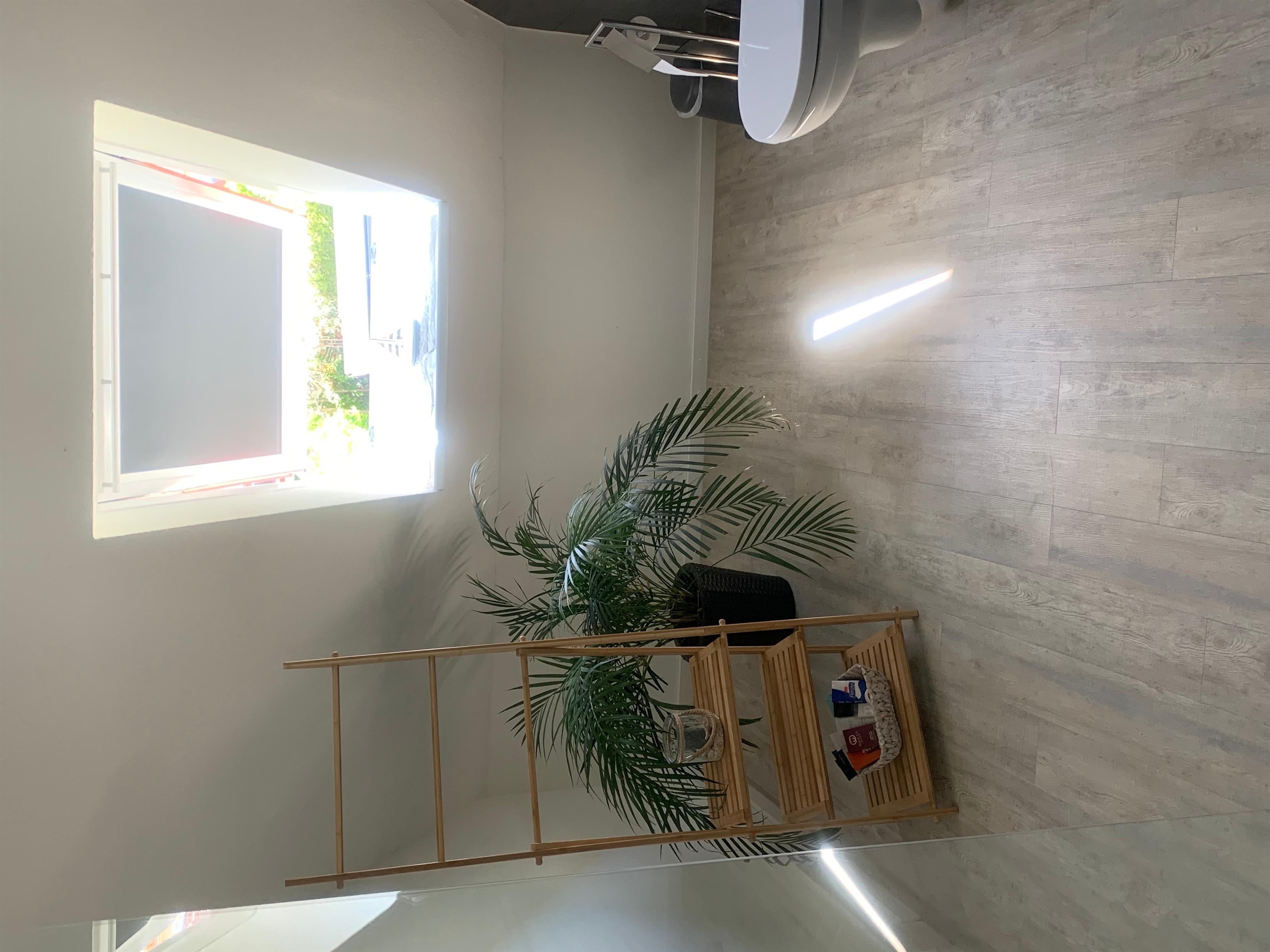 Im Bad befindet sich eine Waschmaschine mit Trockner, beheizbarer Spiegel, Körperwaage, Kosmetikspiegel mit Licht, Tritthocker, ein Holzregal für weitere Ablagefläche, Fön u.v.m.