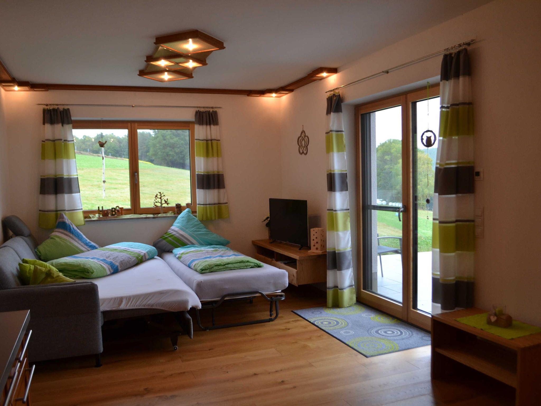 Im großen Wohnraum, befindet sich im Wohnzimmer ein Schlafsofa für 2 Personen.
