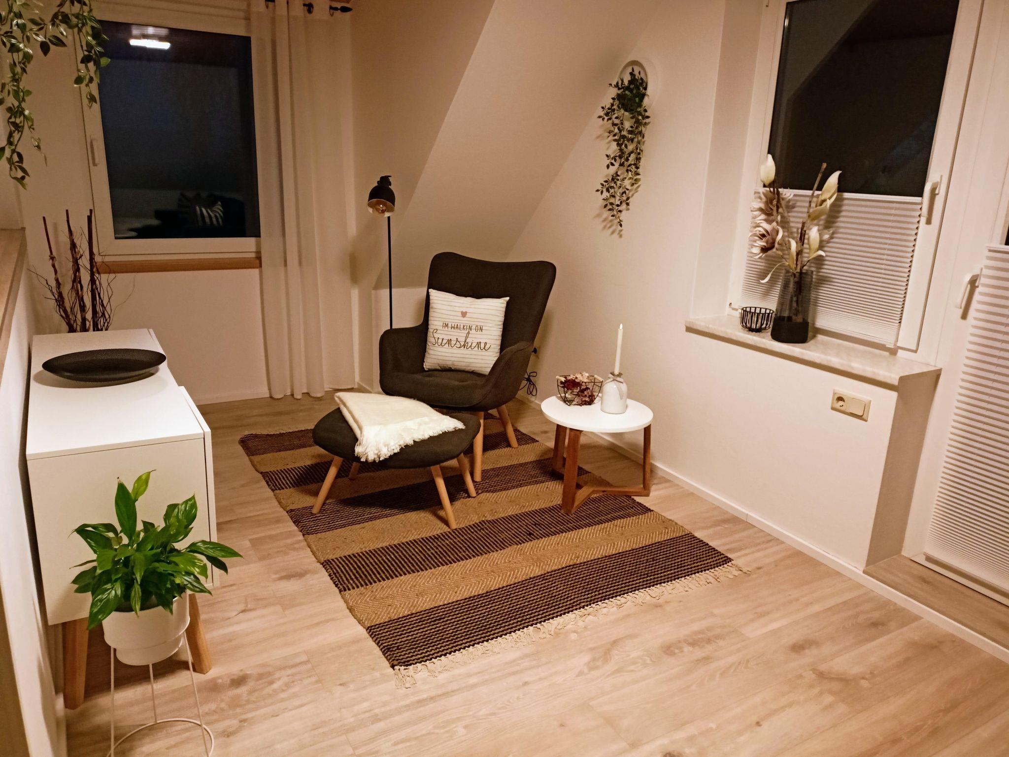 • Großes helles und gemütliches Wohnzimmer mit direkter Zugang zum großen Balkon mit modernen Gartenmöbel