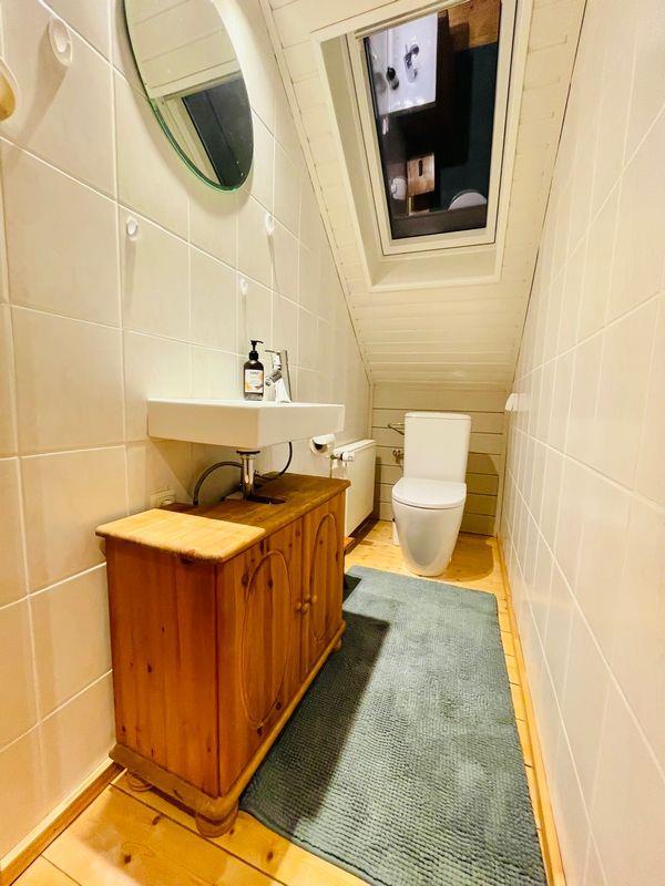 Im Inneren erwartet die Gäste ein großzügiger Wohn- und Essbereich mit einem einladenden Kaminofen. Die angrenzende voll ausgestattete Küche bietet alles, was man für die Selbstversorgung benötigt, inklusive Kaffeemaschine, Geschirrspüler, Backofen, Wasserkocher, Cerankochfeld und Gefriermöglichkeit.