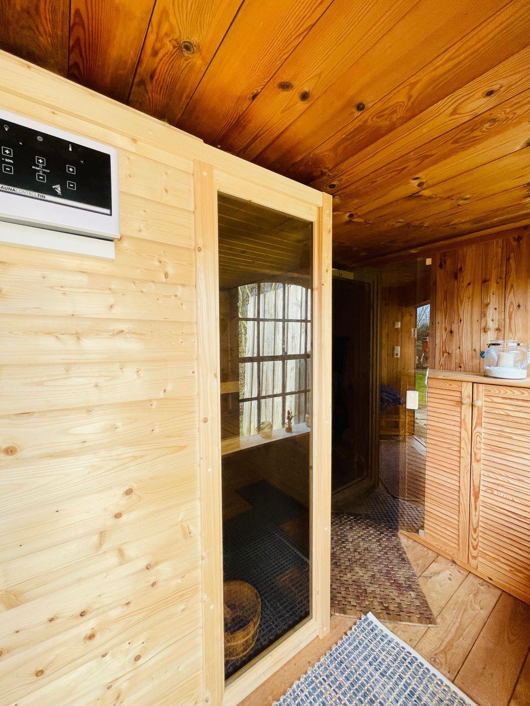 Für aktive Urlauber steht eine E-Bike Ladestation im Carport zur Verfügung. Die Terrasse mit Gartenmöbeln, Grill und Sonnenschirm lädt zum Entspannen im Freien ein, während der großzügige Garten mit Strandkorb und Gartenlaube zum Verweilen einlädt.