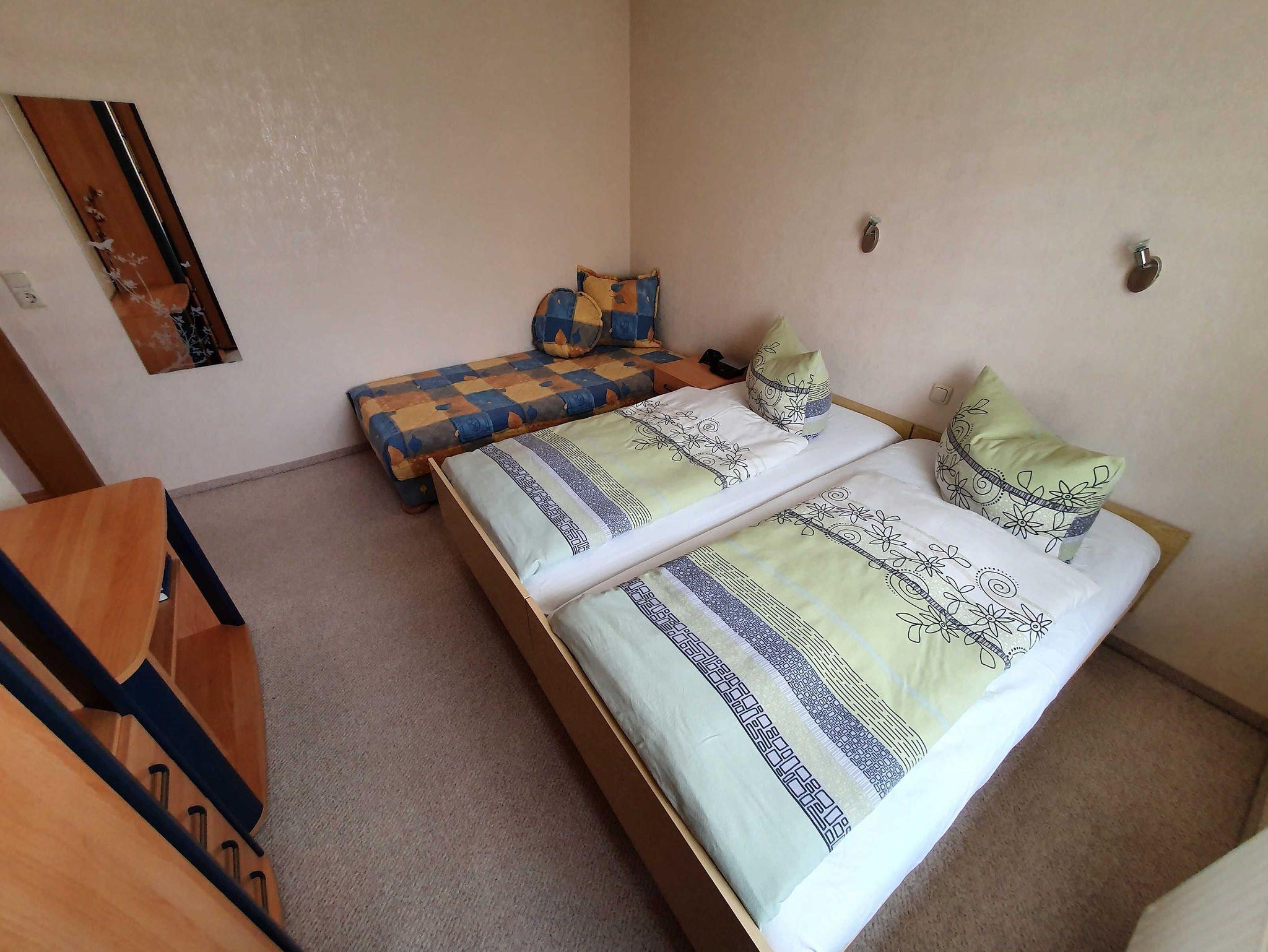 Das Schlafzimmer verfügt über ein Doppel- und ein Einzelbett sowie einem Kleiderschrank. Die Betten sind bei Ihrer Anreise bezogen und das Wäschepaket (Bettwäsche und Handtücher) ist im Reisepreis enthalten. Für den besonderen Schlafkomfort bieten wir Ihnen zusätzlich, auf Anfrage, ein weiteres Kopfkissen in der Größe 40 x 80 cm.