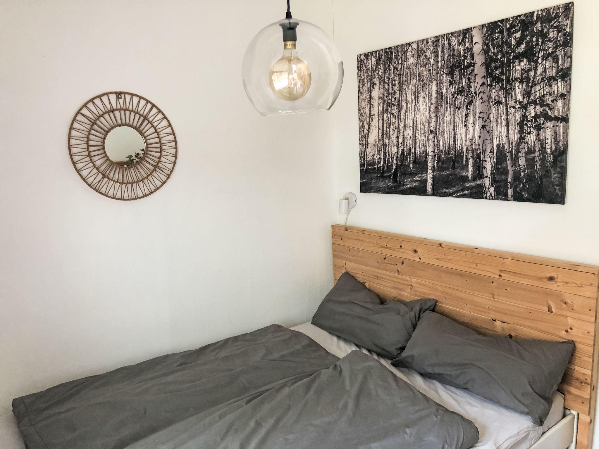 "Alva", 2-room bungalow 26 m2, on the ground floor. Bright, practical and cosy furnishings: living/dining room with Scandinavian wood stove, dining nook and cable TV (flat screen). Exit to the terrace. 1 room with sliding door with 1 double bed (140 cm, length 200 cm). Small kitchenette (4 hot plates, mini-oven, oven, toaster, kettle, electric coffee machine). Shower/WC. Boiler. Large terrace 15 m2. Terrace furniture, barbecue, deck chairs (1). Beautiful view of the forest. Facilities: hair dryer, logs (free). Parking. Please note: fridge without freezer, non-smokers only. Maximum 1 pet/ dog allowed. Smoke alarm.