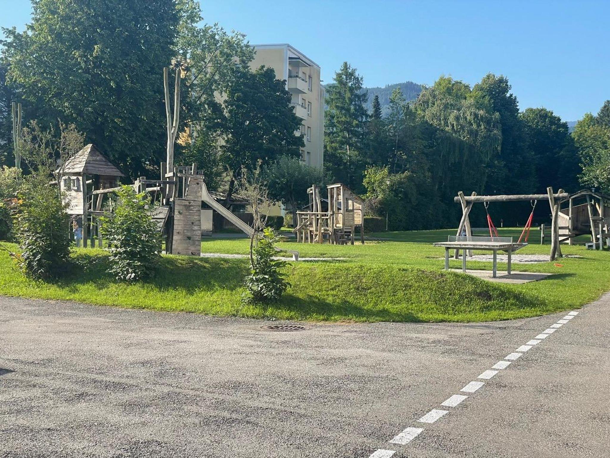 Familien freuen sich über einen großen, schön gestalteten Spielplatz, der nur fünf Gehminuten entfernt liegt.