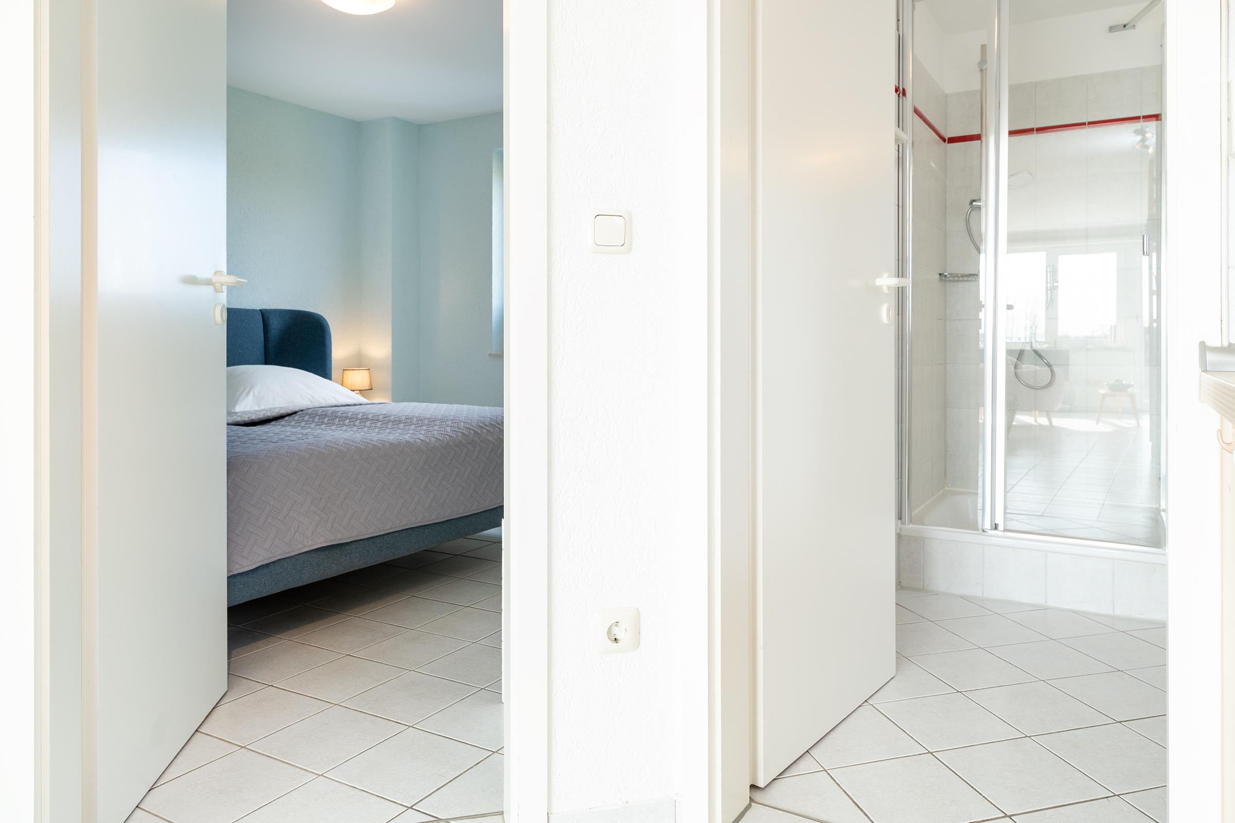 Herzlich Willkommen im blauen Haus. Herzlich Willkommen an einem besonderen Ort! Am Ende einer Sackgasse, direkt am Naturschutzgebiet mit einem fantastischen Blick auf das Meer, die Bucht und die Fehmarnsundbrücke. Zwei Balkone zum Sonnen, Essen und Genießen im Sommer. Ein knisterndes Kaminfeuer im Winter - ein Aufenthalt im Ferienhaus Meerkieker ist zu jeder Zeit ein Erlebnis. Der Eingangsbereich befindet sich im Tiefgeschoss, gleich neben dem PKW-Stellplatz und der Garage. Von dort geht es über eine Wendeltreppe nach oben in den hellen Wohn- und Essbereich mit offener Küche und Zugang zum Balkon. Hier erwarten Sie ein großes Sofa, Sat-TV, Kaminofen sowie ein bequemer Essplatz. Die Küche ist z. B. mit Geschirrspüler, Cerankochfeld, Backofen, Kaffeemaschine und vielem mehr ausgestattet. In diesem Geschoss befindet sich auch ein Schlafzimmer mit Doppelbett (180x200 cm) und ein Duschbad. Über eine weitere Wendeltreppe gelangen Sie zum zweiten Schlafbereich mit zwei Einzelbetten (je 80x200 cm) und einem Vollbad. Sowohl das Dachgeschoss als auch das Erdgeschoss haben einen Balkon mit Meerblick.