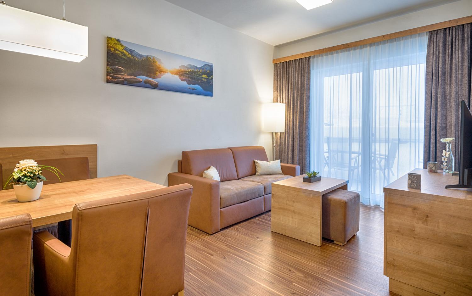 - ein Wohn-/Esszimmer mit Küche (Filter-Kaffeemaschine, Geschirrspülmaschine, Kühlschrank mt Gefrierfach, Herd, Backofen, Toaster, Waserkocher, Mikrowelle) und Schlafsofa 160x195