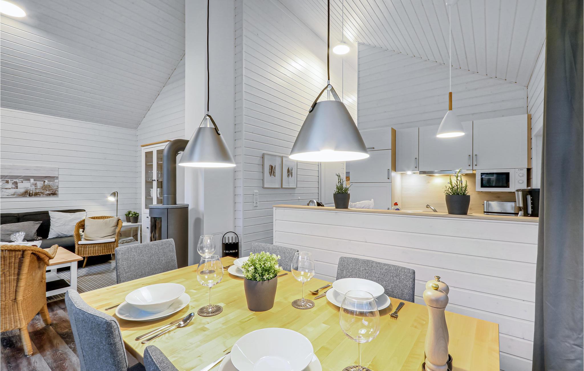 Det första sovrummet har en dubbelsäng, medan det andra sovrummet har två enkelsängar. Barn kan sova på bäddsoffan i vardagsrummet. Köket ligger i ett separat rum utan dörr och är utrustat med hög standard. Frysen erbjuder tillräckligt med utrymme för att kyla den fisk du har fångat. Porslin och bestick finns i dubbel mängd.