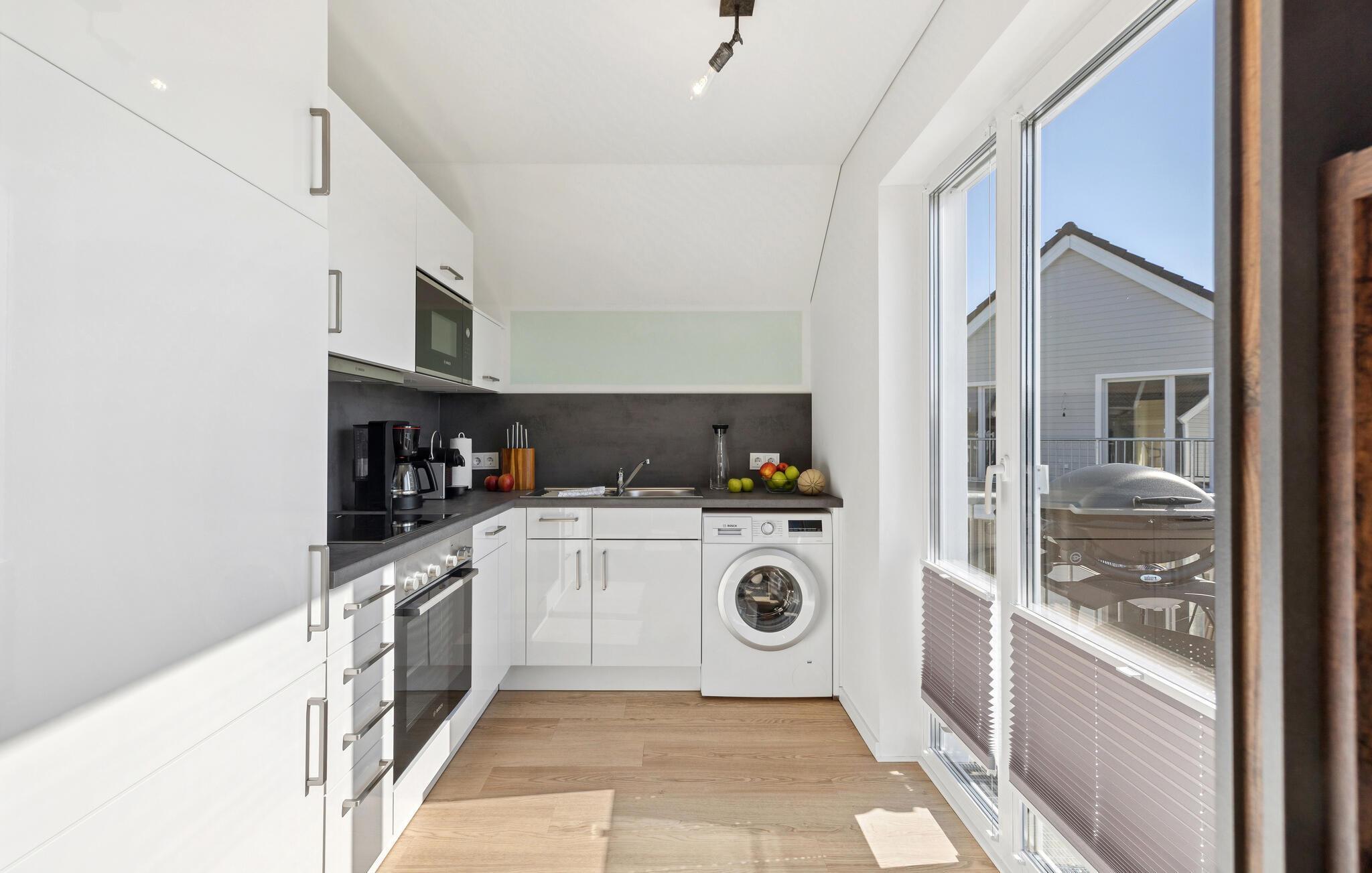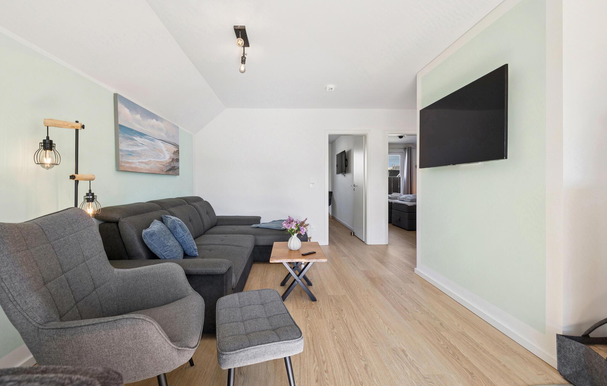 Redan innan du kommer in i lägenheten välkomnas du av en mysig balkong med en strandstol. När du kommer in i lägenheten öppnar en hall upp sig och leder dig in i det rymliga vardagsrummet/matsalen med öppen planlösning och angränsande kök. Här väntar en bekväm sittgrupp som bokstavligen inbjuder till avkoppling, medan Smart TV:n står för den bästa underhållningen. Den öppna spisen ger rummet en rustik atmosfär, perfekt för mysiga kvällar. Ett stort matbord erbjuder inte bara tillräckligt med utrymme för gemensamma måltider, utan blir också centrum för glada sammankomster.