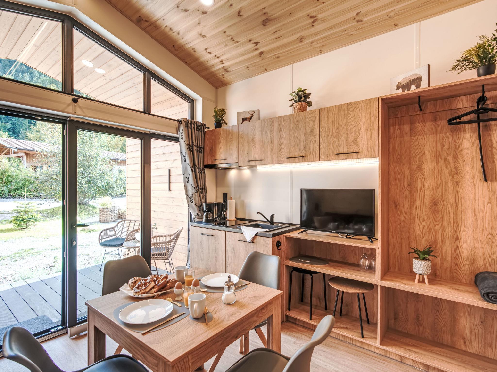 "Tiny Haus Glockenalm-Haus Glockenalm", 3-room mobile home 33 m2 on 2 levels. Object suitable for 2 adults + 3 children. Tasteful and cosy furnishings: living/dining room with satellite TV and air conditioning. 1 room with 1 double bed (160 cm, length 200 cm). Open kitchen (2 ceramic glass hob hotplates, kettle, electric coffee machine). Shower/WC. Upper floor: (steep stair), 1 open room with sloping ceilings, ceiling height 50 - 110 cm with 3 sleeping facilities (3 x 80 cm, length 200 cm). Electric heating. Terrace. Terrace furniture. Beautiful view of the mountains. Parking (1 car) at the house. Please note: smoke alarm.