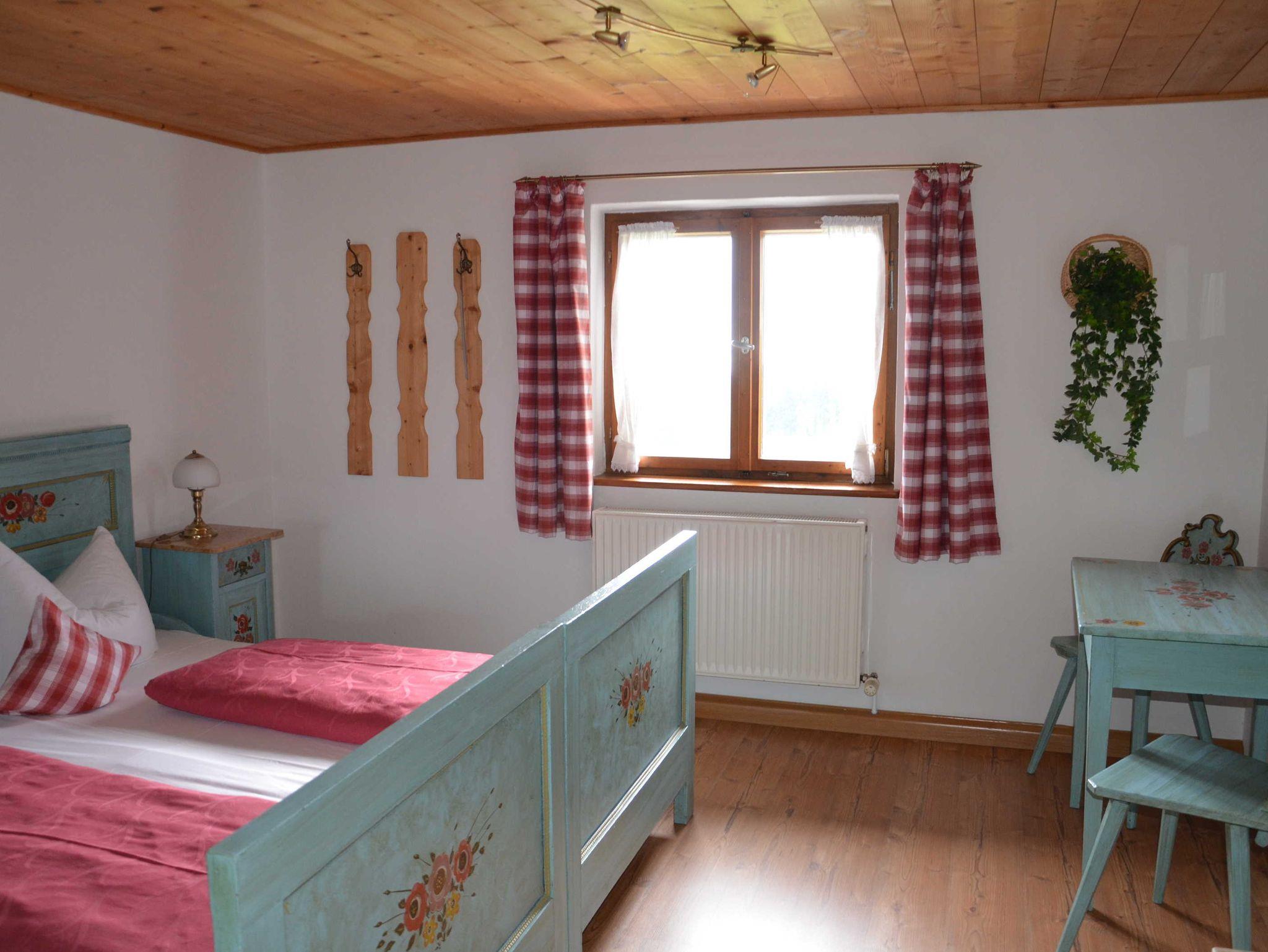 Unsere Ferienwohnung Haflinger (51 qm), im 2. OG gelegen, ist mit gemütlichen bayrisch bemalten Möbeln ausgestattet und verfügt über ein Elternschlafzimmer mit Doppelbett (Zustellbett möglich), einem Kinderschlafzimmer mit 2 Betten. Bitte beachten Sie, dass die Betten im Kinderzimmer nur über eine Länge von 1,85 m verfügen. Das Bad ist mit einer Dusche, WC, Kosmetikspiegel und Föhn ausgestattet.