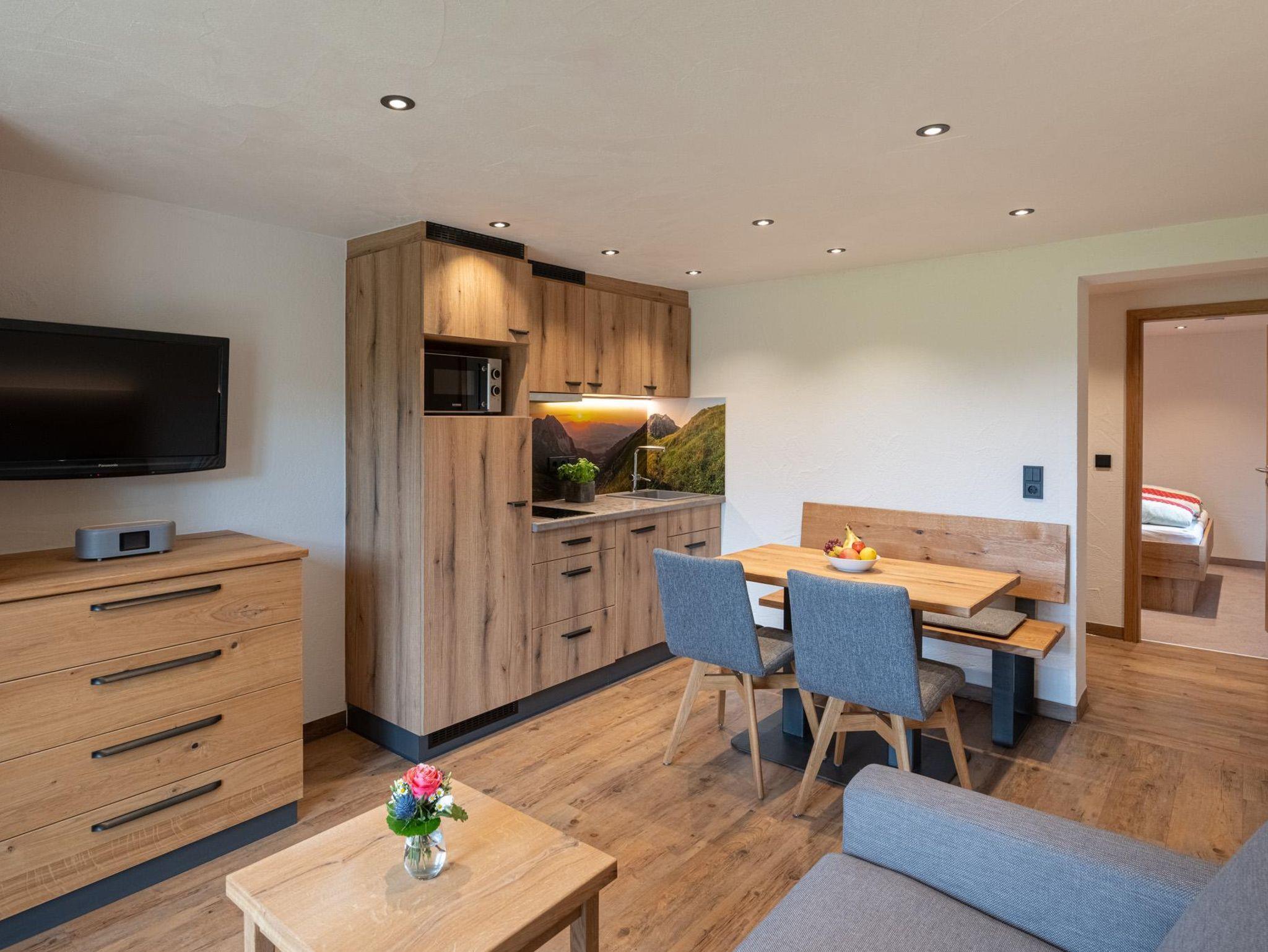 Ferienwohnung Sonnenkopf eignet sich ideal für Familien mit bis zu 2 Kindern oder Ruhesuchenden, die gerne ein wenig mehr Platz möchten. Das getrennte Schlafzimmer und die großzügig, ausklappbare Schlafouch im Wohnbereich bieten eine Heimat für 1-4 Personen. Balkon mit Morgensonne inklusive.