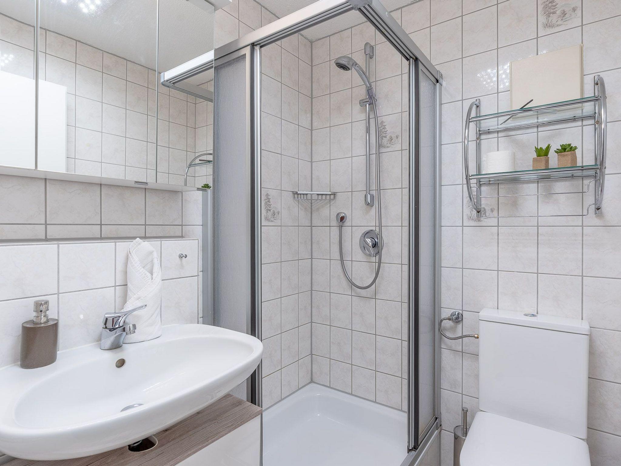 Das Badezimmer beinhaltet eine Dusche, ein Waschbecken, ein Föhn und ein WC.