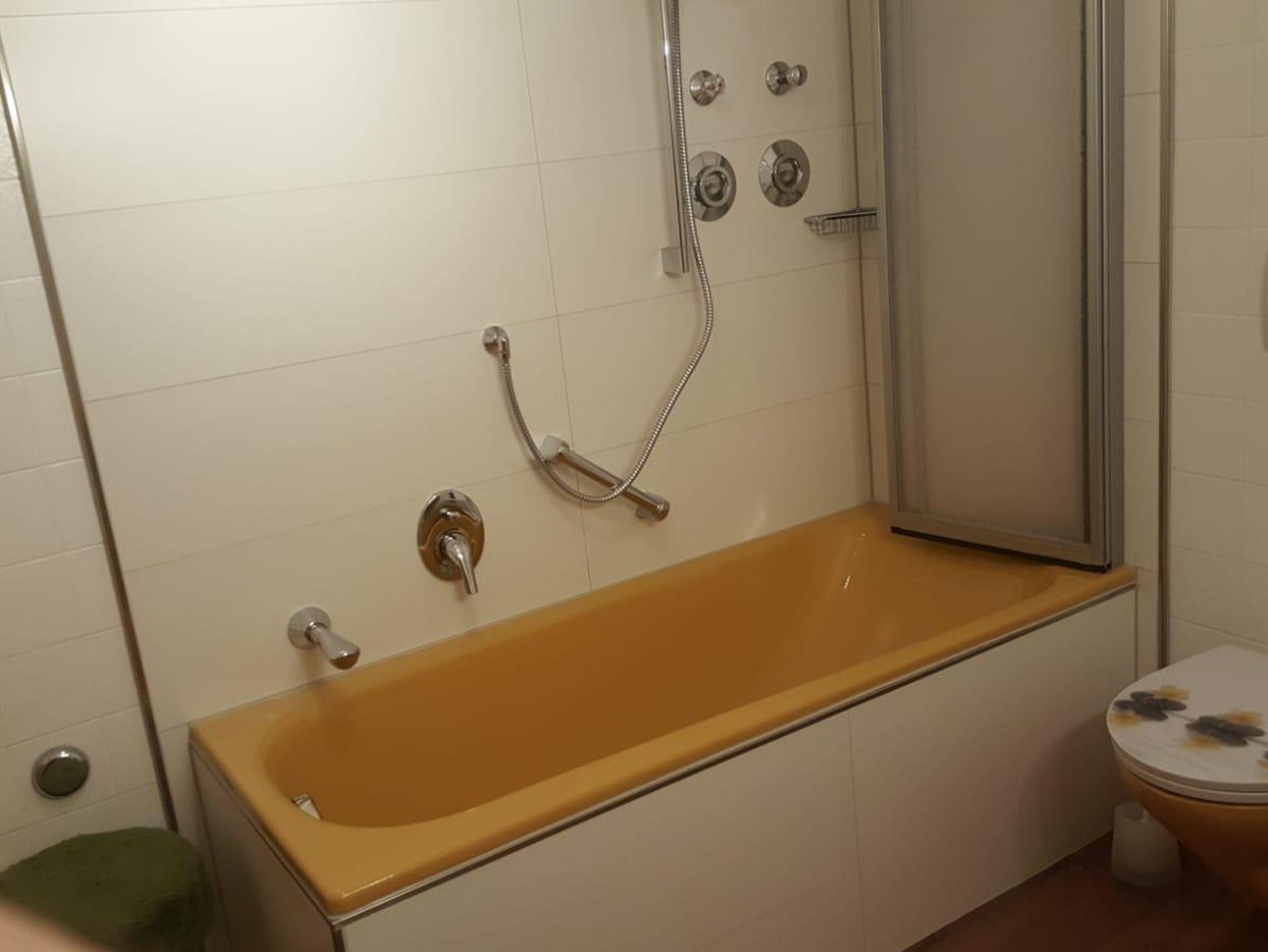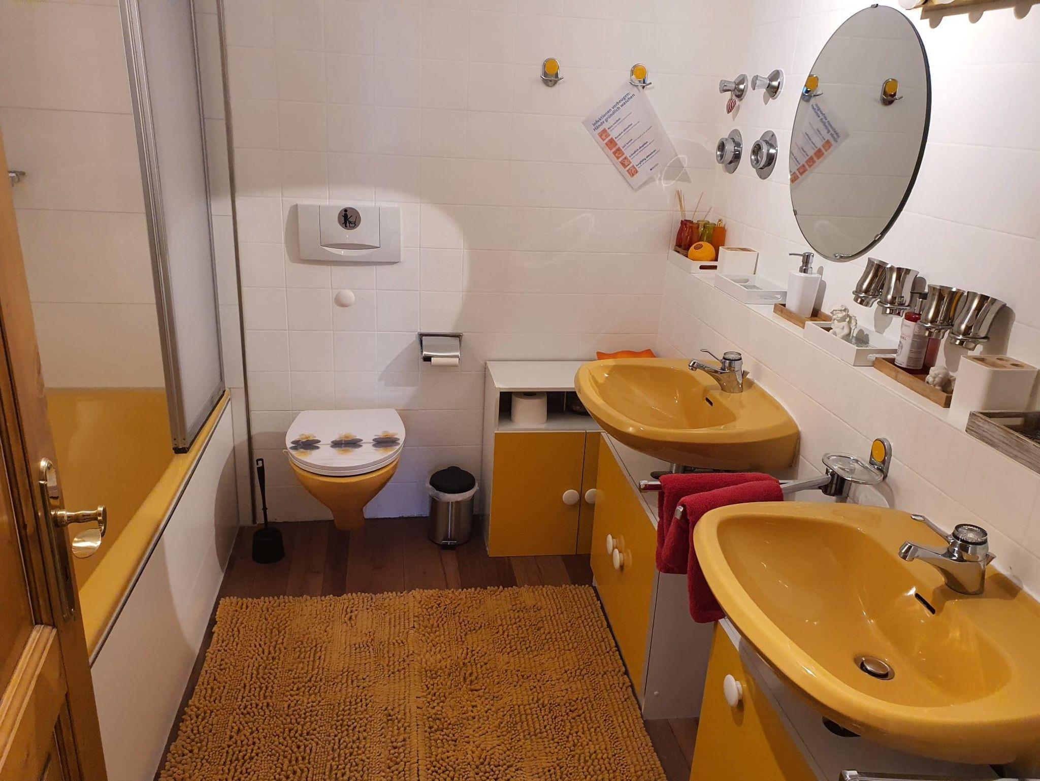 Bad: Badewanne mit Duschabtrennung, 1 Toilette, 2 Waschbecken, 2 Spiegel, Kommoden+Hocker+Föhn