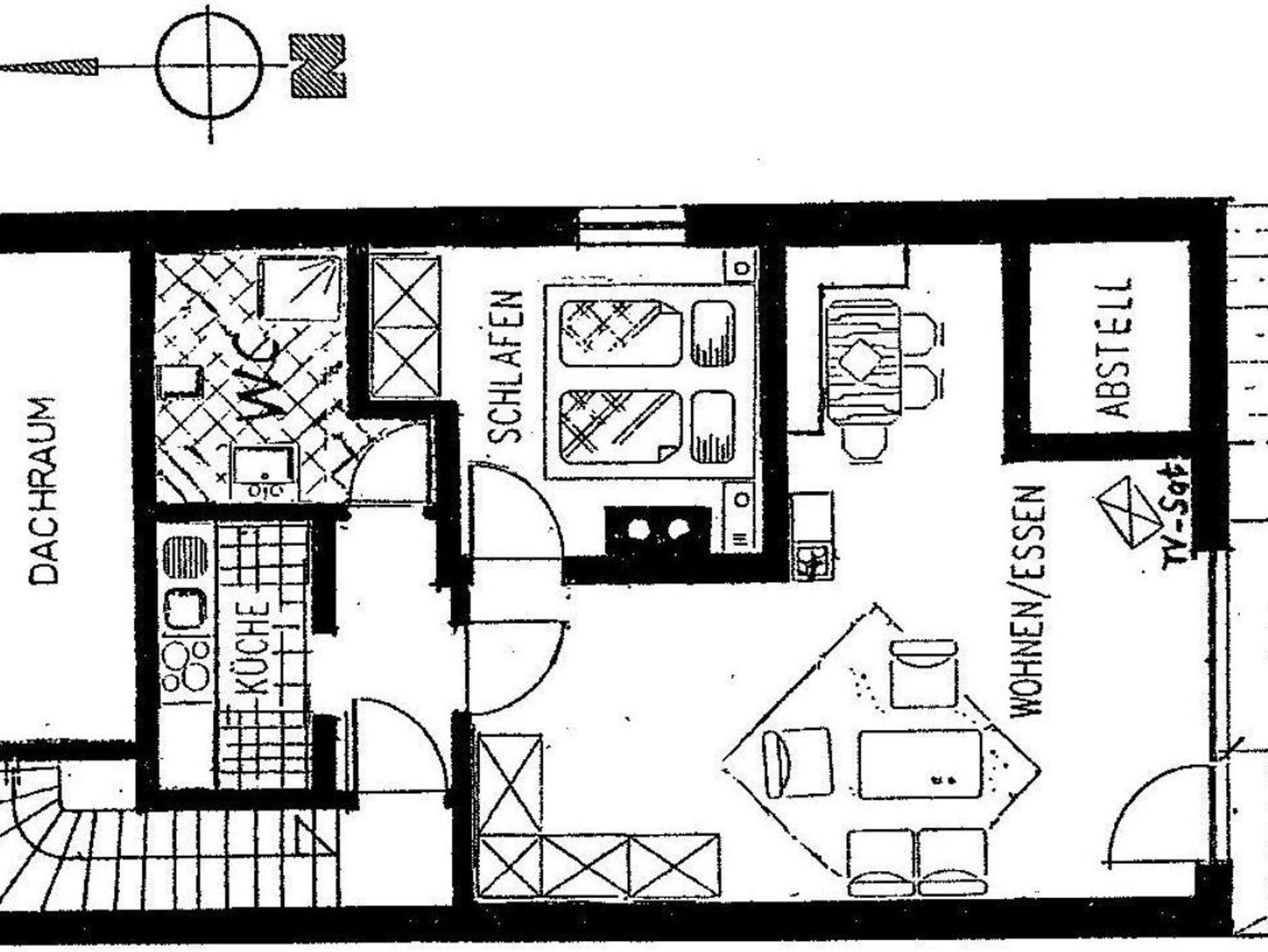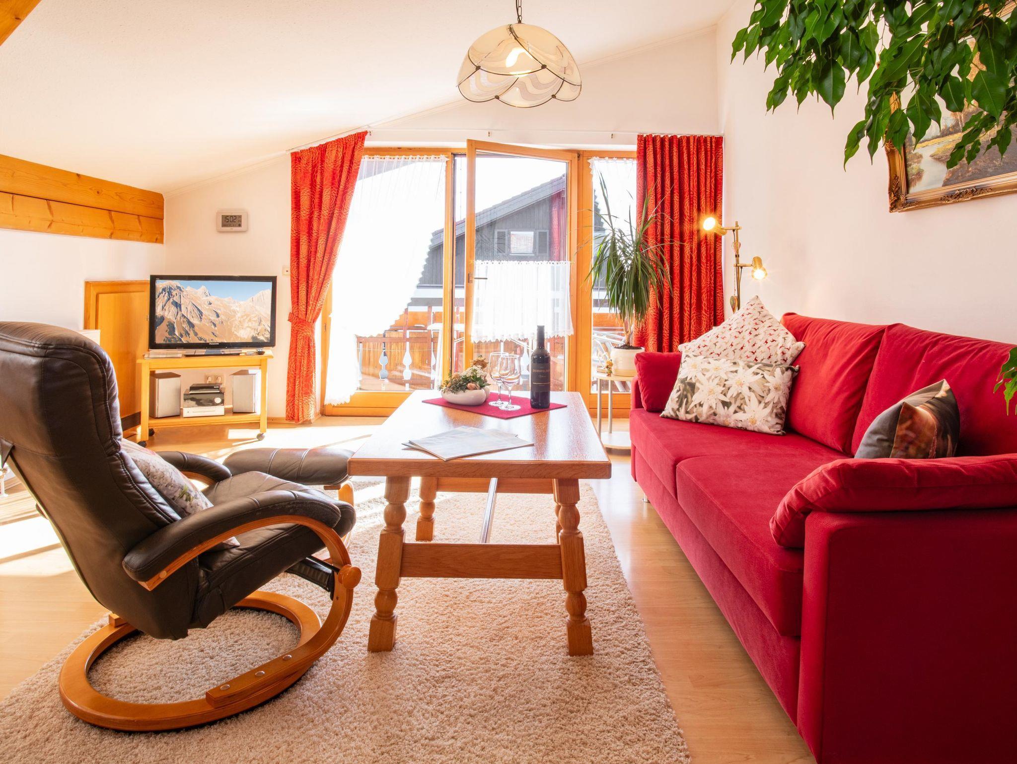 Die sonnige Wohnung hat einen großen Wohnraum mit gemütlicher Essecke, Sitzgarnitur (Schlafcouch) Sat-TV, separates Schlafzimmer, Du/WC, Küche und Südbalkon mit freiem Panoramablick.