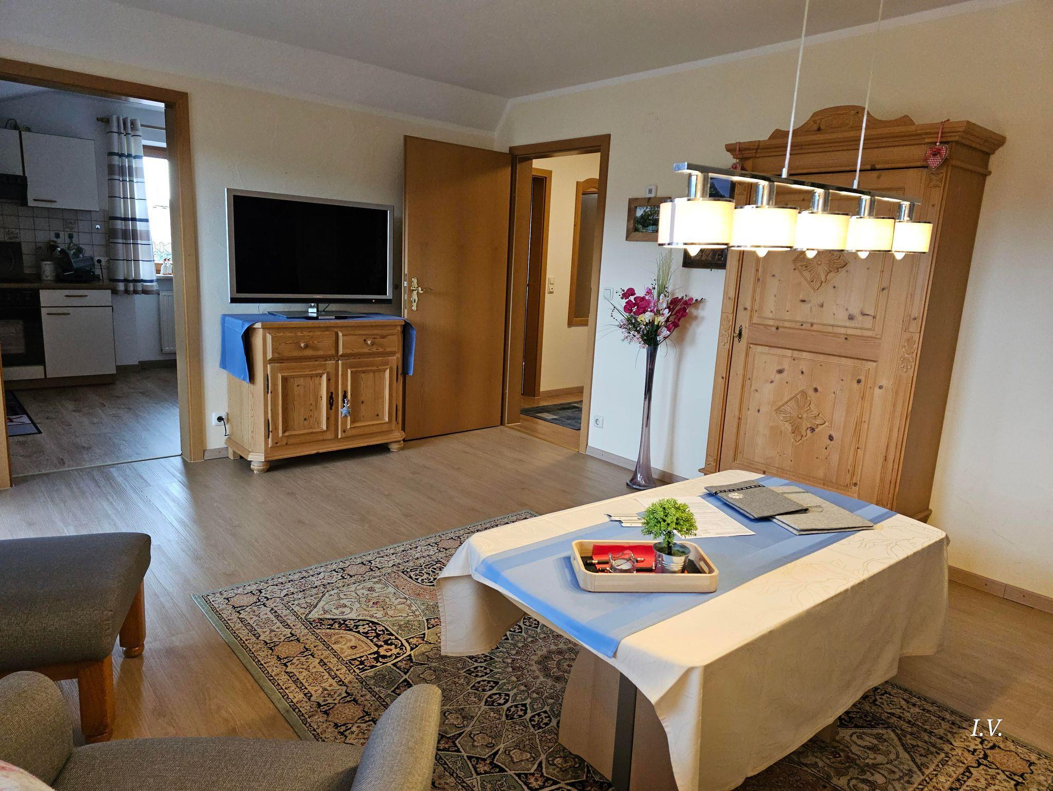Diese ländlich ausgestattete Obergeschosswohnung in blauem Ambiente bietet Ihnen auf dem Westbalkon ausreichend Platz für sonnige Stunden bei Kaffee u. Kuchen; und ein gemütliches Abendbrot im Sonnenuntergang,mit Blick auf die Bolsterlanger Bergkette. Eine separate voll ausgestattet Küche mit Eckbank, ein Tageslichtbad und ein kuscheliges Schlafzimmer komplettieren die Ausstattung.