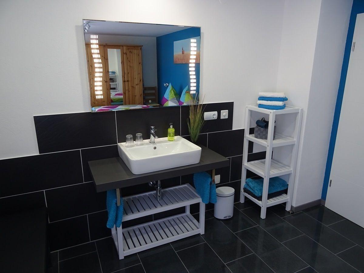 Im Badezimmer befindet sich eine ebenerdige Dusche, ein Waschbecken und ein Fön. Das WC ist in einem separaten Raum.