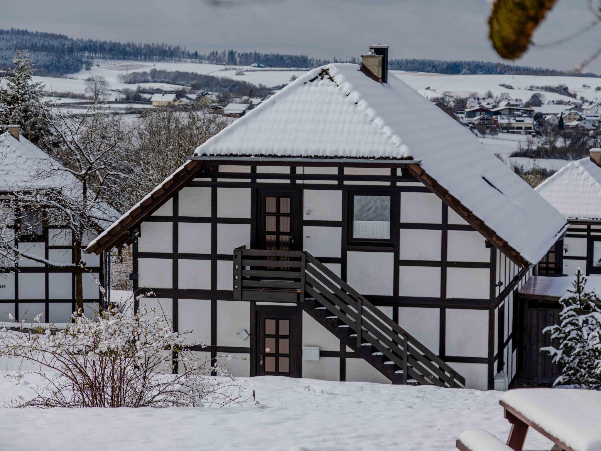 Outside, you will find a quiet lawn surrounding the holiday home. A paved path leads you to the wooden outside staircase, which you can use to enter the flat. The detached house is located at the end of a very quiet cul-de-sac in the upper part of the holiday village of Frankenau, just a few metres from the forest entrance to the Kellerwald.