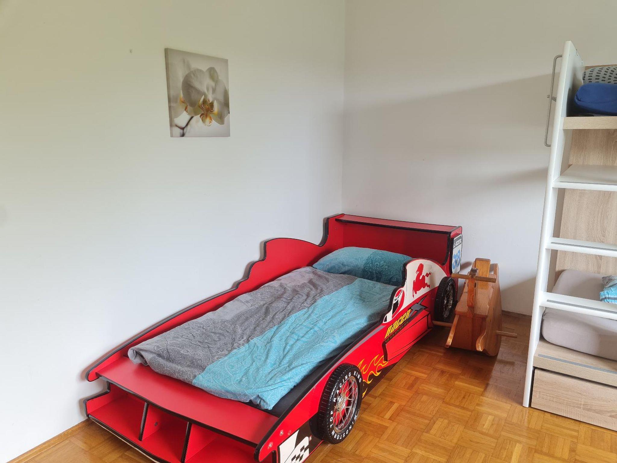 In der Wohnung im 1. OG erwartet sie ein Wohn/Schlafraum mit einem Doppelbett (1,80x2,00), eine Ausziehcouch (1,40x1,90), ein Schreibtisch, TV und Kleiderschrank. Vom Balkon aus haben sie einen wunderschönen Blick in den eigenen Garten und den Nachbargarten mit Obstbäumen. Die komplett ausgestattete Küche mit Geschirrspüler, Kühlschrank, Herd, Backofen, Eierkocher, Toaster, Kaffeemaschine mit Kaffee lässt keine Wünsche offen. In der gemütlichen Essecke in der Küche können Sie entspannt mit Blick ins Tal ihr Frühstück oder ihr zubereitetes Mahl zu sich nehmen. Im Kinderzimmer finden sie ein Stockbett (0,90x2,00), ein Autobett (0,90x2,00), viele verschiedene Spiele, Spielsachen, Kinderbücher und ein Kinderkicker. Im Badezimmer finden sie eine Badewanne, ein Waschbecken und ein WC mit Duschgel, Haarshampoo, Föhn, Handcreme, Bodylotion und genügend frische Handtücher für alle Gäste.