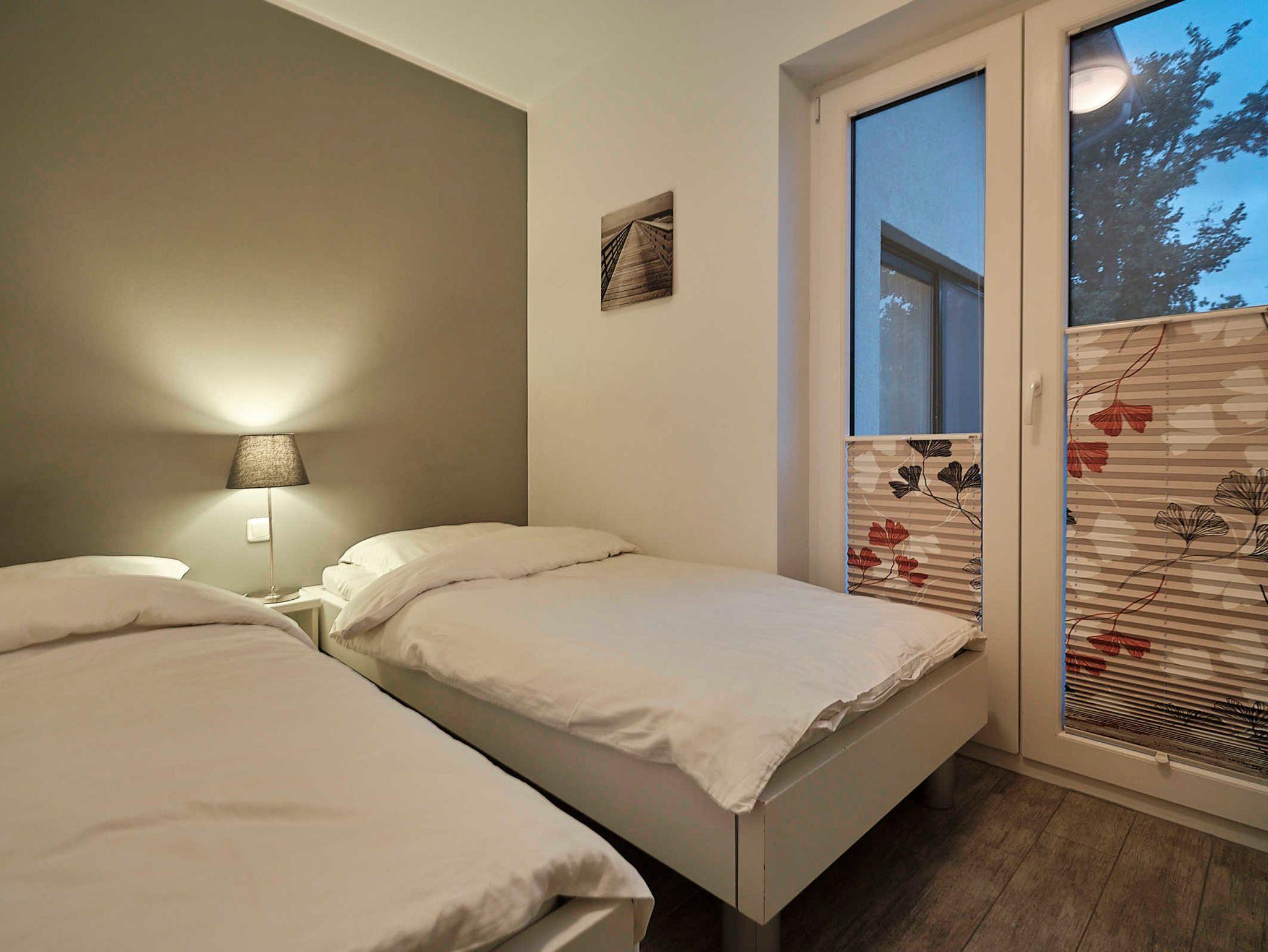 1x Schlafzimmer mit zwei Einzelbetten und Schreibtisch, TV mit Streaming TV