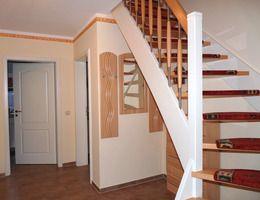 Das Ferienhaus am Fleesensee in Untergöhren ist neu erbaut und komfortabel für Sie eingerichtet. Über eine Außentreppe gelangen Sie auf die höhere Ebene im Garten zum Hauseingang. Diesen betreten Sie über eine Stufe im Flur mit Flurgarderobe, Spiegel und Schuhschrank. Von hier gelangen Sie in das Wohnzimmer, die Küche ein Bad und den Abstellraum. Das Wohnzimmer ist eingerichtet mit zwei Couchen, einem Sessel, einem kleinen Tisch, einer weiteren Sitzecke mit zwei Sesseln und einem Beistelltisch, einem Sideboard, dem Esstisch mit Stühlen, dem Fernseher und dem Kamin. In der Küche finden Sie einen kleinen Tisch mit Stuhl und eine moderne Einbauküche mit allem was Ihr Herz begehrt. Sie ist ausgestattet mit einem Backofen, einem Cerankochfeld, einem Kühlschrank mit Tiefkühlfach, einem Geschirrspüler, einem Spülbecken, einer Mikrowelle, einer Dunstabzugshaube, einer Kaffeemaschine, einem Wasserkocher, einem Toaster und einem Radio. Im Badezimmer des Erdgeschosses gibt es eine ebenerdige Dusche, einen Waschtisch mit Schrank, einen Spiegelschrank und das WC. Im Abstellraum haben Sie Platz für Ihre Koffer. Über eine Treppe im Flur gelangen Sie nach oben zu den drei Schlafzimmern und einem weiteren Bad. Alle Schlafzimmer haben einen Zugang zu einem kleinen Balkon. Das große Schlafzimmer zur Seeseite mit Seeblick ist eingerichtet mit einem 1,80 m Doppelbett, einem Kleiderschrank, einem Relaxsessel, einem kleinen Tisch, einem Stuhl und einem Fernseher. Ein weiteres Schlafzimmer ist eingerichtet mit einem 1,60 m breites Doppelbett, einer Garderobe, einem Wäscheschrank und einem Stuhl. Im dritten Schlafzimmer sind ein 1,40 m breites Doppelbett, eine Kommode, eine Garderobe und ein Radio. Das Bad dieser Etage hat eine Badewanne, ein Waschbecken, einen Spiegel, ein WC und eine Handtuchheizung. Die untere Etage des Ferienhauses ist mit einer Fußbodenheizung beheizbar. Auf dem Grundstück können Sie zwei Terrassen mit Gartenmöbeln nutzen. Die obere Terrasse ist gleich am Eingang. Auf der untere Terrasse steht ein Steingrill und ein Holzgartenhaus, in dem Sie Ihre Fahrräder unterbringen können. Einen Parkplatz unter dem Carport gibt es auf dem Grundstück. Weitere Parkplätze finden Sie auf dem 50 m entfernten öffentlichen Parkplatz.
