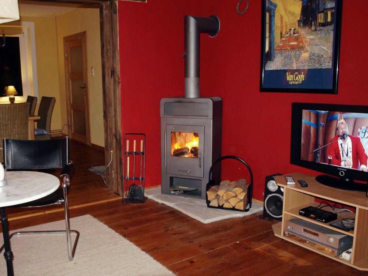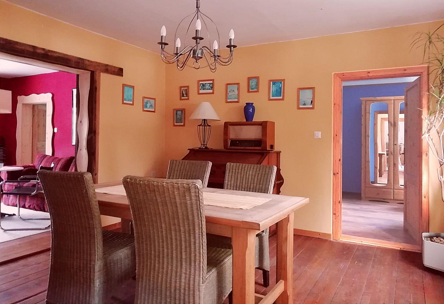 An die Küche grenzt eine kleine Kammer. Dort finden Sie Sportgeräte wie Beach-Ball, Badminton, Boulekugeln und diverse Gesellschaftsspiele für den Abend oder kalte Tage. Auch eine Waschmaschine und eine kleine Kühltruhe befinden sich dort. Das Esszimmer liegt neben der Küche. Am gediegenen Eichentisch mit 6 Stühlen lässt es sich gut dinieren oder spielen. Außerdem gibt es ein altes Harmonium, an dem talentierte für ein wenig musikalische Unterhaltung sorgen können. Genießen Sie Ihr Frühstück wenn morgens die Morgensonne ins Fenster des Esszimmers strahlt. Der Raum öffnet sich mittels eines breiten Durchgangs zum Wohnzimmer hin. Hier stehen eine Couch und 2 Sessel. Eine Stereoanlage, DVD Player, diverse Filme, Musik-CDs und Bücher und ein digitaler Satelliten TV ergänzen das Freizeitangebot. Am Abend durchflutet die Abendsonne mit Ihrem warmen Licht dieses Zimmer. Für die kalte Jahreszeit gibt es einen Kaminofen..
