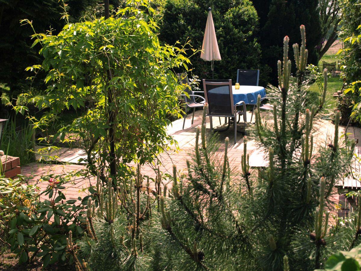 Die Küche hat eine Tür zur lichtdurchfluteten Terrasse im Garten – gesäumt von Blumenrabatte und Goldfischteich. Sonnenschirm, Tisch und 4 Stühle stehen zur Verfügung. Hinter dem Haus in der Wiese gibt es einen Grillplatz mit Erfrischungsbassin, 90 cm tief, und Fontaine. Das Becken wird regelmäßig gereinigt. An heißen Sommertagen hopsen Sie einfach ins kalte Wasser oder lassen die Beine hinein baumeln. Es gibt übrigens auch eine Gartendusche. Im Schuppen steht eine Tischtennisplatte, die benutzt werden darf. Kellen und Bälle sind vorhanden. Ihren PKW können Sie auf dem Grundstück parken.