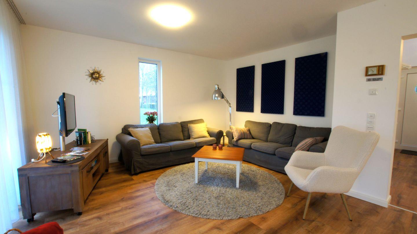 befinden sich die Sitzecke mit zwei Couchen, Sessel und TV-Möbel. Die große