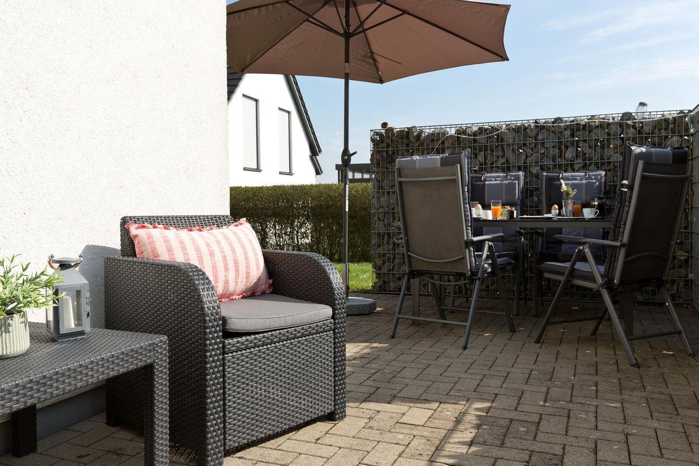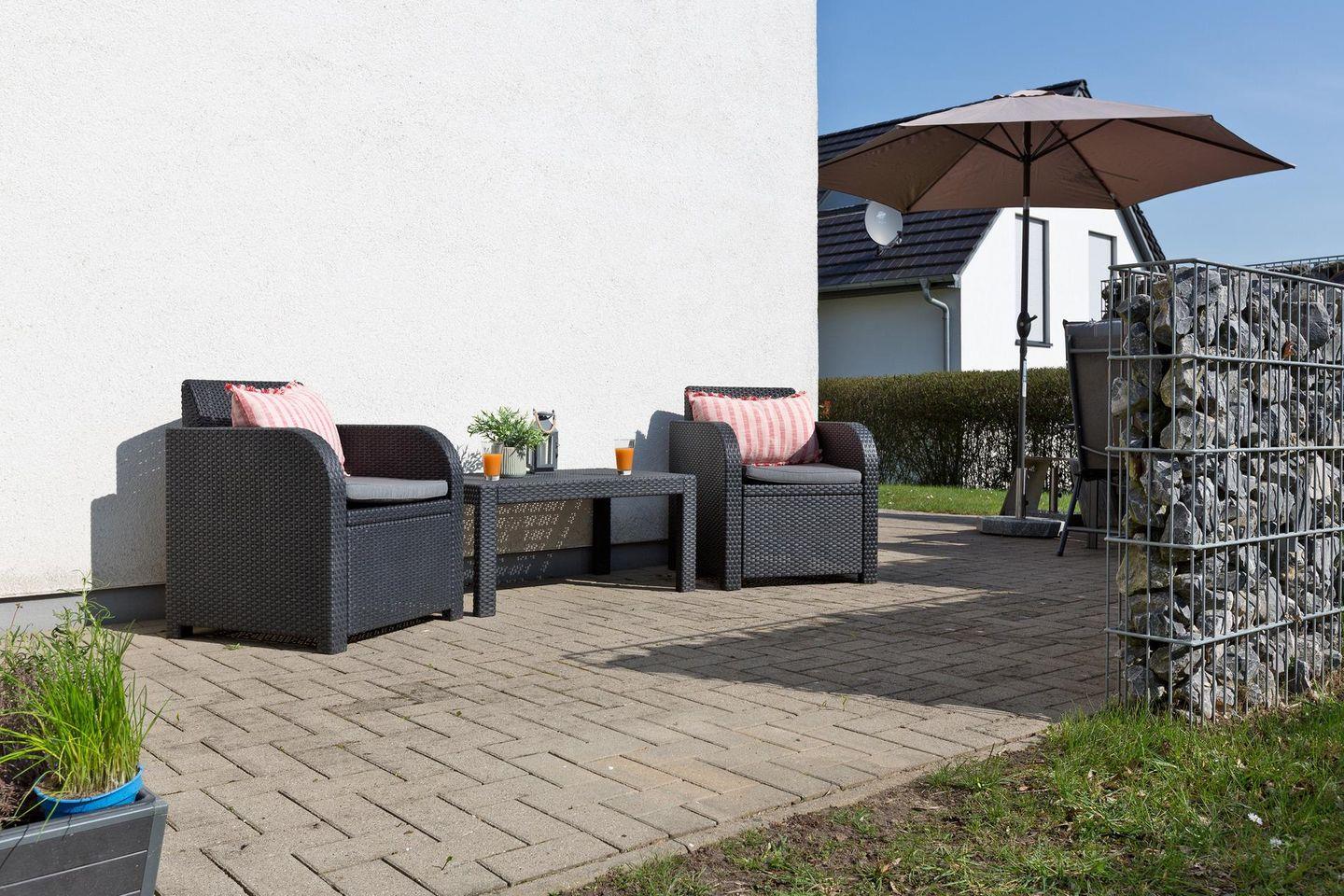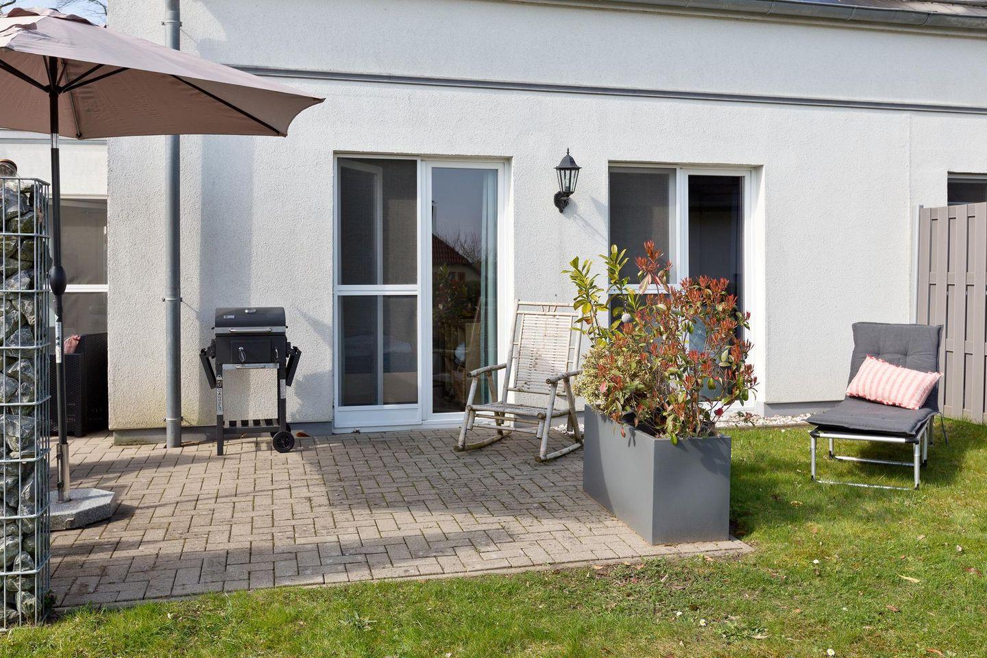 Die Fenster- und Terassentüren sind bodentief und sorgen für viel Licht und machen den Zugang zur Terrasse aus allen Zimmern möglich( inkl. Insektenschutz). Alle Zimmer verfügen über eine Fußbodenheizung und sind einzeln regulierbar. Das geflieste Bad verfügt über eine Dusche mit Regenschauerfunktion und über einen Handtuchwärmer. Die im Bad integrierte Sauna sorgt für eine entspannte Wellnesserholung in Ihrem Urlaub. Im Abstellraum finden Sie einen Staubsauger, eine Waschmaschine und einen Wäscheständer. Im Außenbereich stehen Loungemöbel, ein Gartentisch mit Klappstühlen, ein Sonnenschirm und ein Grill für Sie bereit. So kann der Tag entspannt bei einem Glas Wein und gutem Essen ausklingen .
