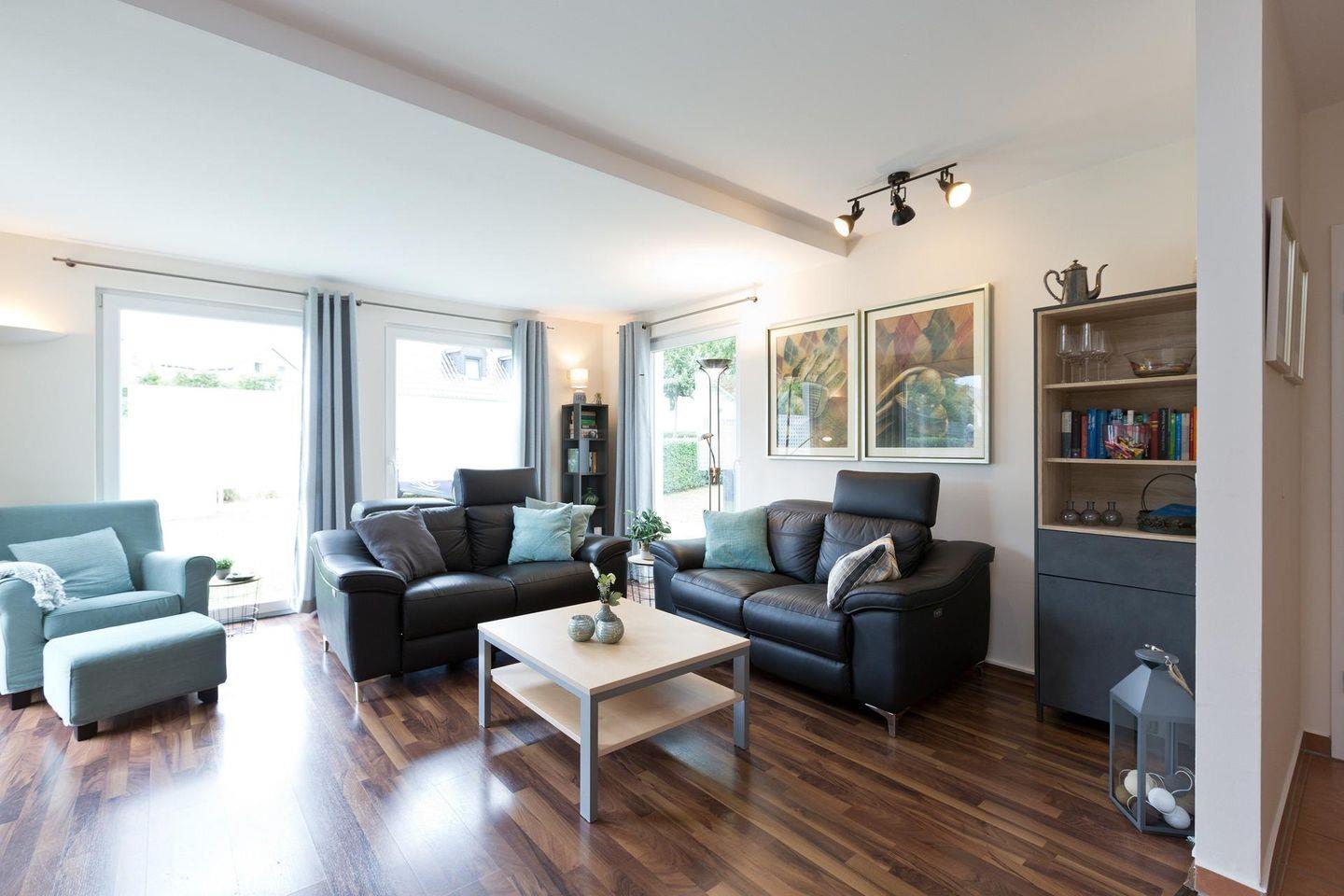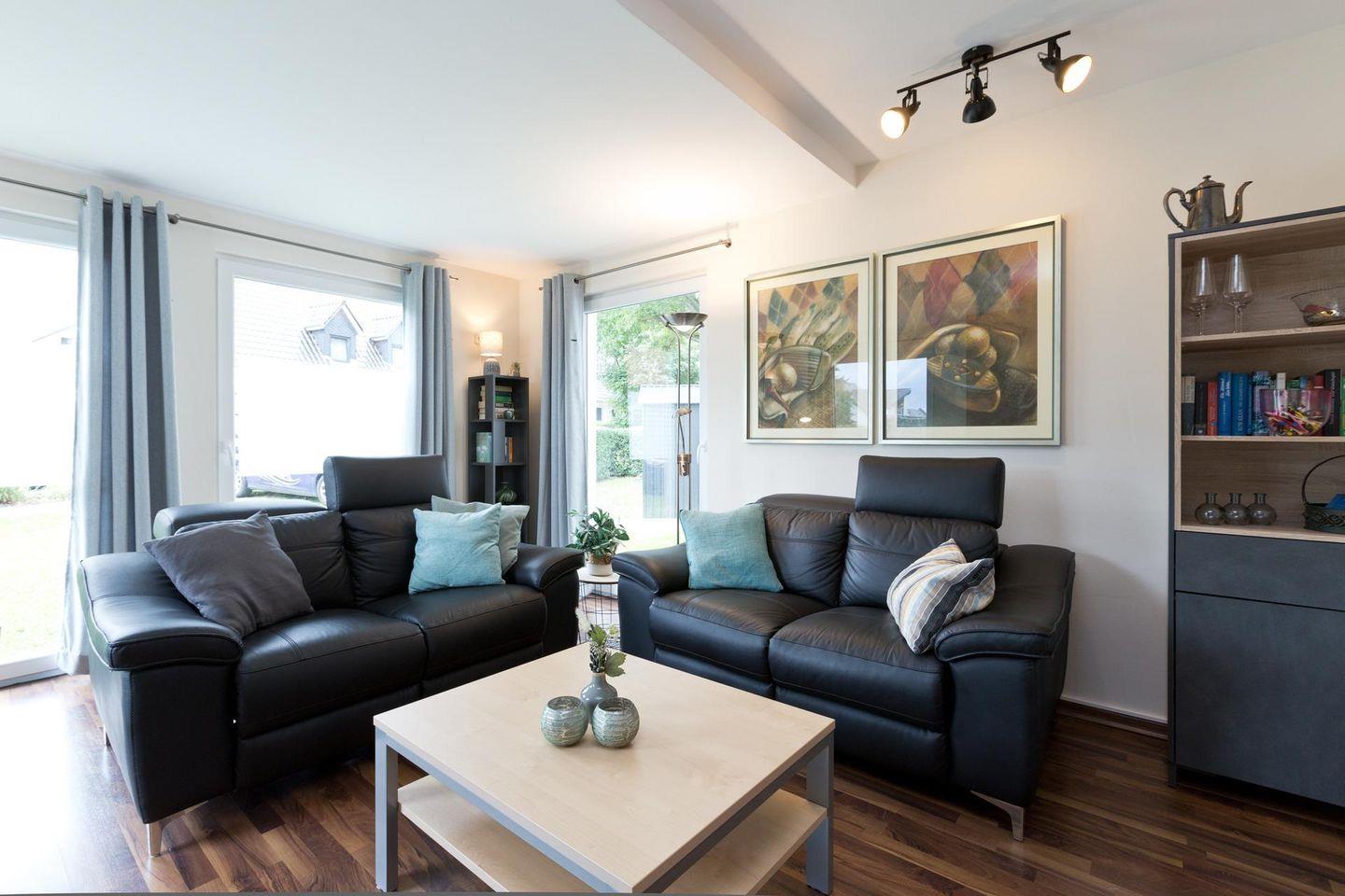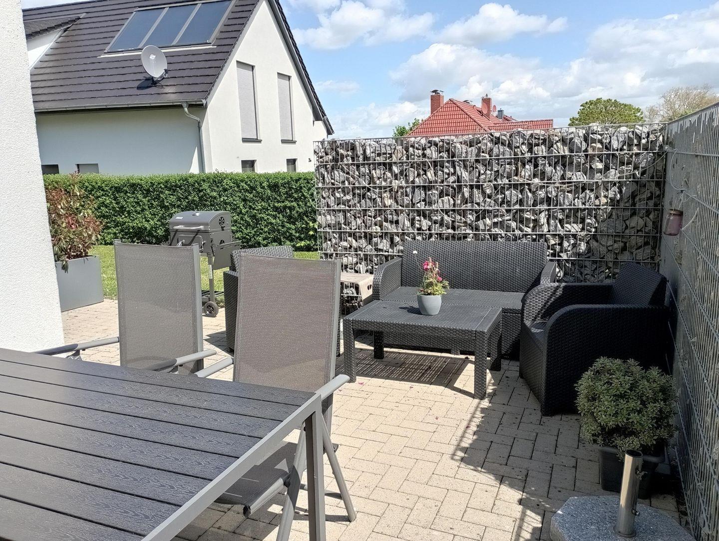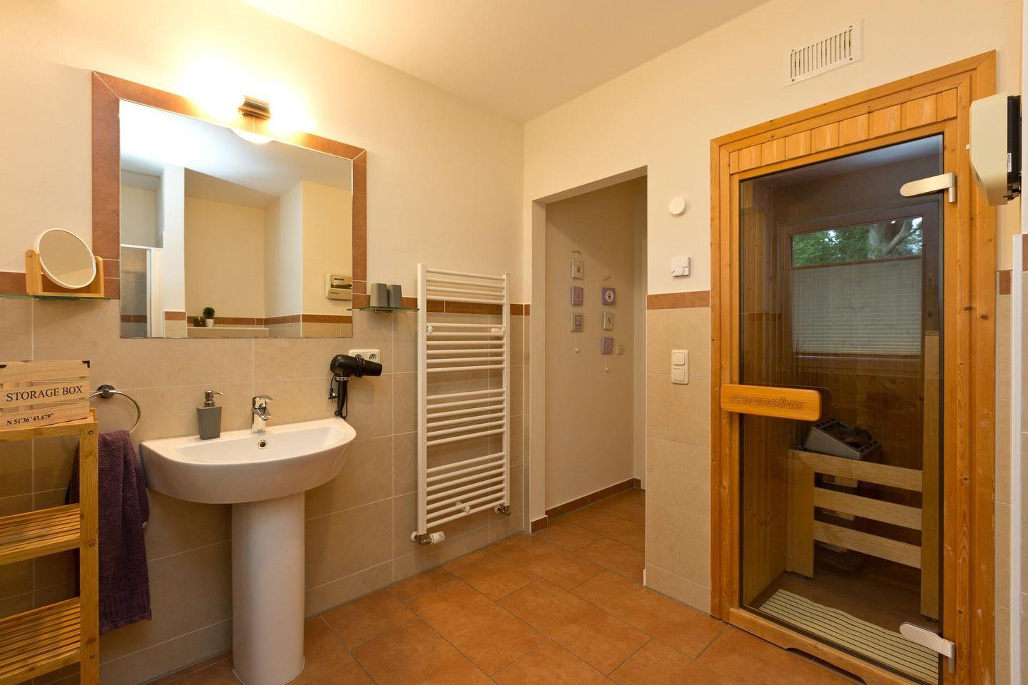 Die Fenster- und Terassentüren sind bodentief und sorgen für viel Licht und machen den Zugang zur Terrasse aus allen Zimmern möglich( inkl. Insektenschutz). Alle Zimmer verfügen über eine Fußbodenheizung und sind einzeln regulierbar. Das geflieste Bad verfügt über eine Dusche mit Regenschauerfunktion und über einen Handtuchwärmer. Die im Bad integrierte Sauna sorgt für eine entspannte Wellnesserholung in Ihrem Urlaub. Im Abstellraum finden Sie einen Staubsauger, eine Waschmaschine und einen Wäscheständer. Im Außenbereich stehen Loungemöbel, ein Gartentisch mit Klappstühlen, ein Sonnenschirm und ein Grill für Sie bereit. So kann der Tag entspannt bei einem Glas Wein und gutem Essen ausklingen .