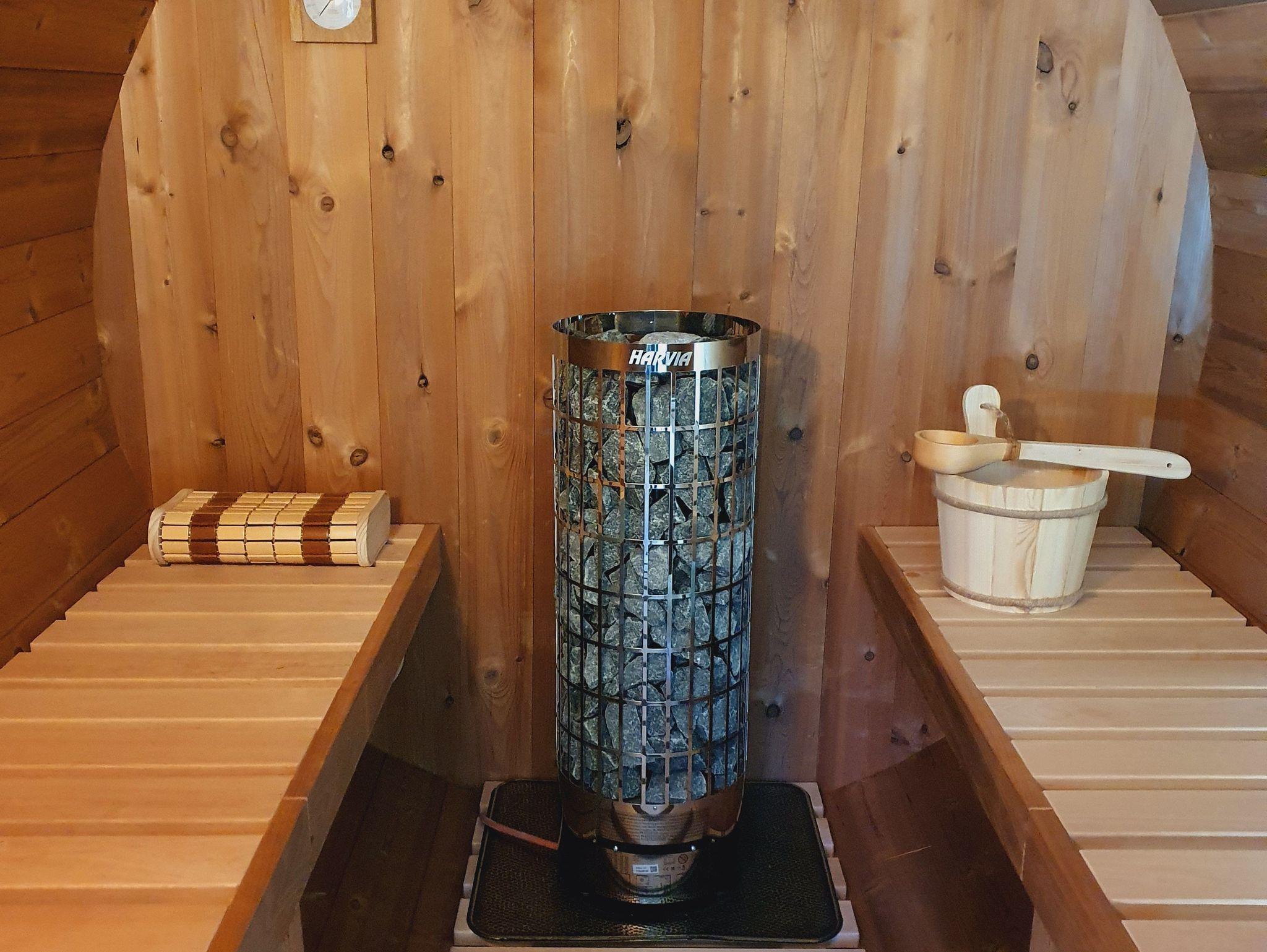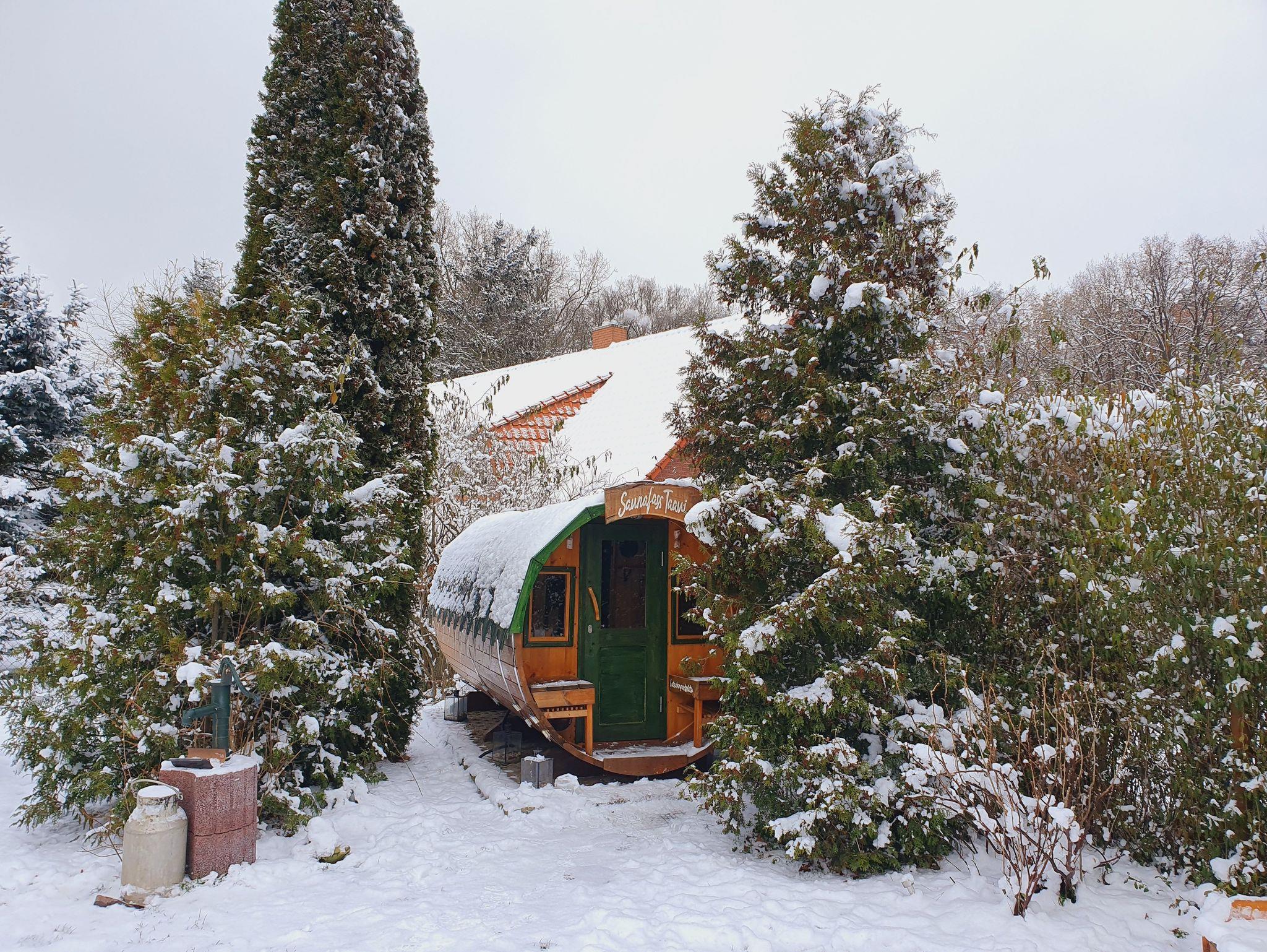 Abgerundet wird das ganze durch eine große überdachte Terrasse mit Strandkorb & vielen Sitzgelegenheiten (mit (Vor-)Mittagssonne für gemütliches Frühstücken draußen), 2 Parkplätze am Haus (weitere Parkplätze kostenfrei 5 Min. zu Fuß) & einen eingezäunten grünen sonnigen Garten mit Sitzgelegenheiten, Liegen, Sandkasten, Feuerstelle, Hollywoodschaukel & Fahrradständern (gemeinsame Nutzung mit Ferienhaus Milena nebenan). Abends lädt der steinerne Grillkamin mit angrenzender überdachter Picknicklaube zum Barbecue ein. Im Garten befindet sich auch unser großes Sauna-Fass Taavi. Die Nutzung erfolgt in Absprache mit dem Ferienhaus Milena nebenan. Das Fass hat einen separaten Vorraum zum Umziehen und Ausruhen und einen großen Saunaraum mit 2 langen Liegen.