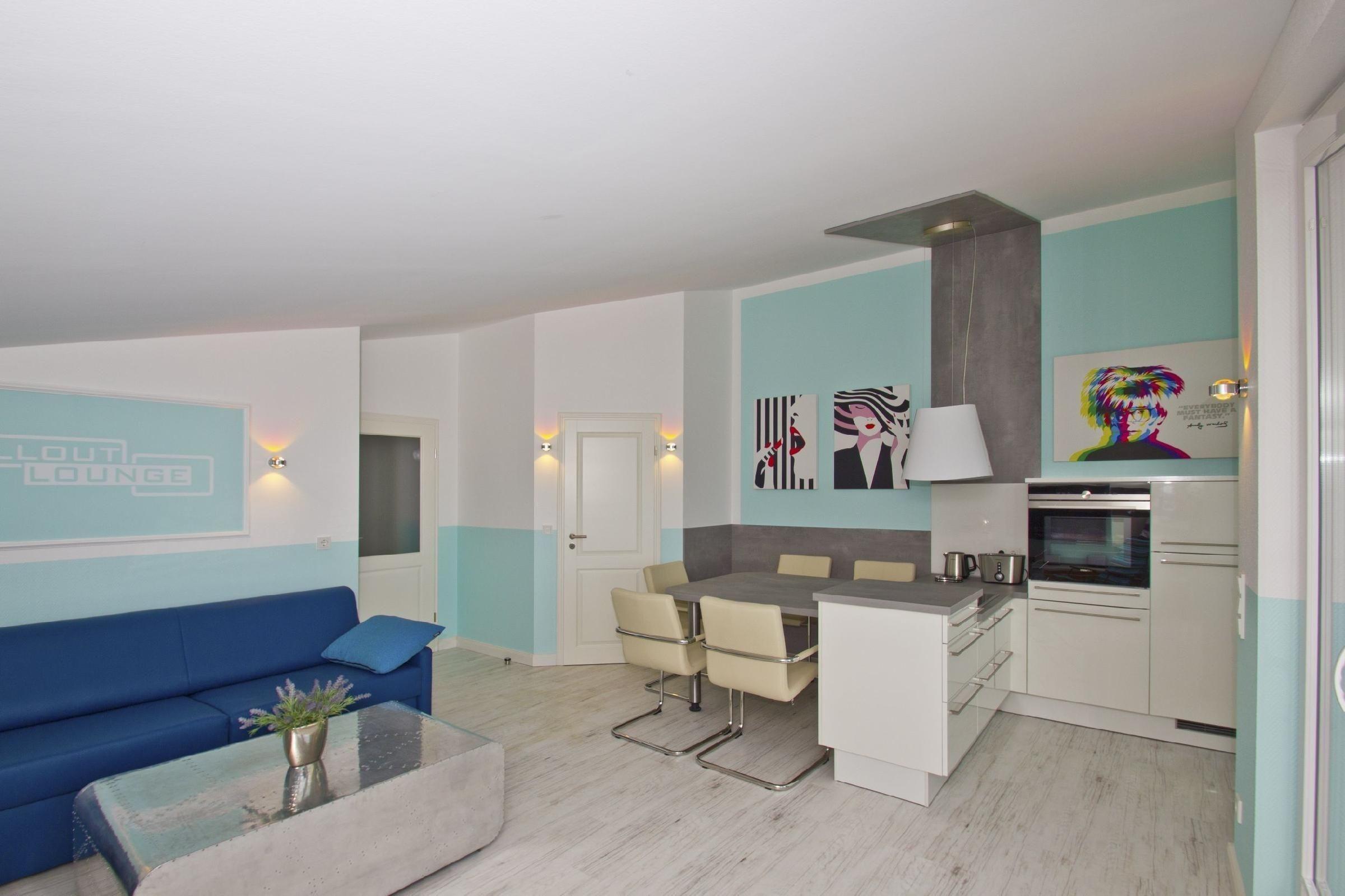 Die Ferienwohnung bietet ein modernes und allergikerfreundliches Ambiente, ideal für Erholungssuchende. Sie verfügt über zwei geräumige Schlafzimmer mit komfortablen Doppelbetten und zwei Badezimmer, die jeweils mit bodengleicher Dusche, Badewanne und Fenster ausgestattet sind. Die offene Küche ist mit hochwertigen Geräten wie Geschirrspüler, Elektro-/Gasherd, Backofen, Mikrowelle und Kühlschrank ausgestattet und lädt zum gemeinsamen Kochen ein. Eine gemütliche Essecke und eine HiFi-Anlage sorgen für gesellige Abende. Der Wohnbereich umfasst ein einladendes Sofa, Sessel und großen TV. Zusätzliche Annehmlichkeiten wie WLAN, Waschmaschine, Wäschetrockner sowie ein Parkplatz runden das Angebot ab. Die Fußbodenheizung sorgt für wohlige Wärme. Ein Safe und Rauchmelder bieten zusätzlichen Komfort und Sicherheit. Kurzum: Die Ferienwohnung vereint alle Elemente für einen unvergesslichen Aufenthalt.