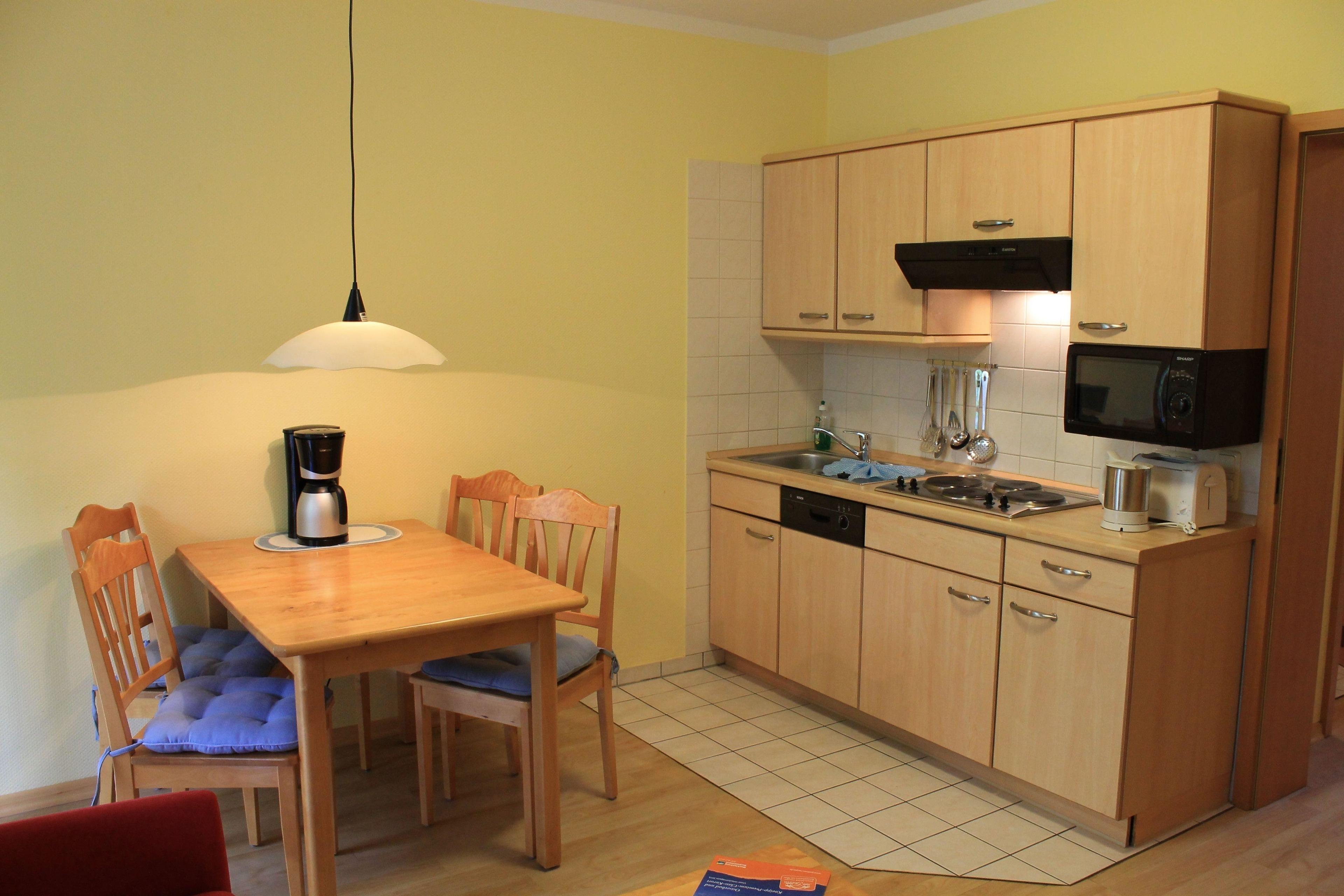 Sie betreten die Wohnung durch einen geräumigen Flur mit einem großem Kleiderschrank, der viel Stauraum bietet. Von dem Flur geht der kombinierte Wohn- und Essbereich ab. Hier finden Sie eine komplett ausgestattete Küchenzeile (Geschirrspüler, Kühlschrank mit Gefrierfach, Kochfeld mit 4 Platten, Kaffeemaschine, Wasserkocher, Toaster, Geschirr und Besteck). Daneben schließt sich der Essbereich mit Platz für bis zu 4 Personen an.
