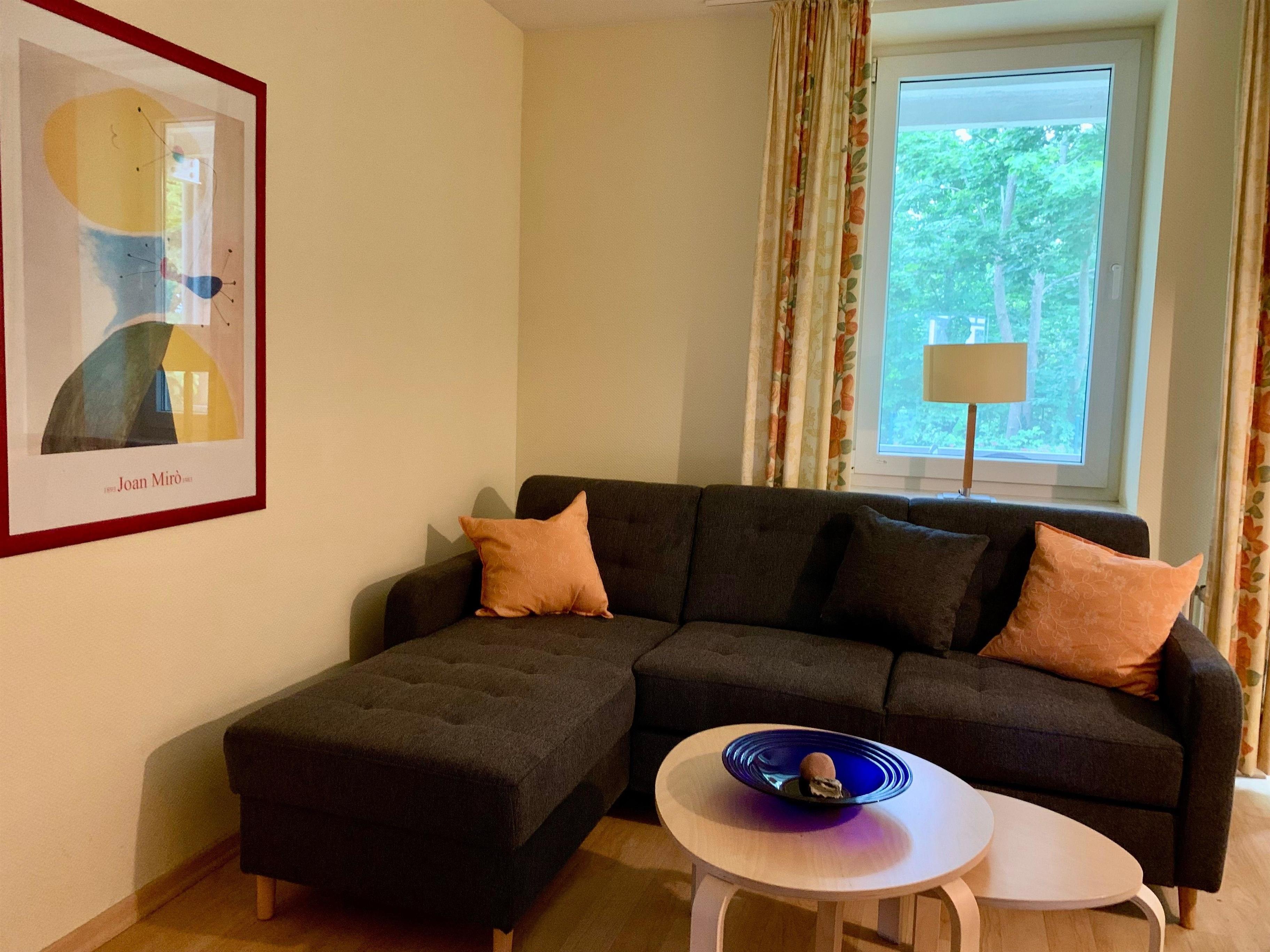 Der Wohnbereich mit TV und kombiniertem Radio lädt zum Entspannen ein. Neben der ausklappbaren Schlafcouch ist der Zugang zum Balkon mit Blick in den Garten. Auf dem überdachten Balkon können Sie das Meeresrauschen genießen und in der Nebensaison kann man durch die Bäume auch einen Blick auf die Ostsee werfen. Das praktisch eingerichtete Schlafzimmer ist mit einem Bett mit den Maßen 1,60 x 2,00m ausgestattet. Zusätzlich kann auch ein Kinderreisebett untergebracht werden, welches wir gerne kostenfrei zur Verfügung stellen. Das innenliegende Badezimmer ist mit WC, Dusche, Waschbecken und Fön ausgestattet.