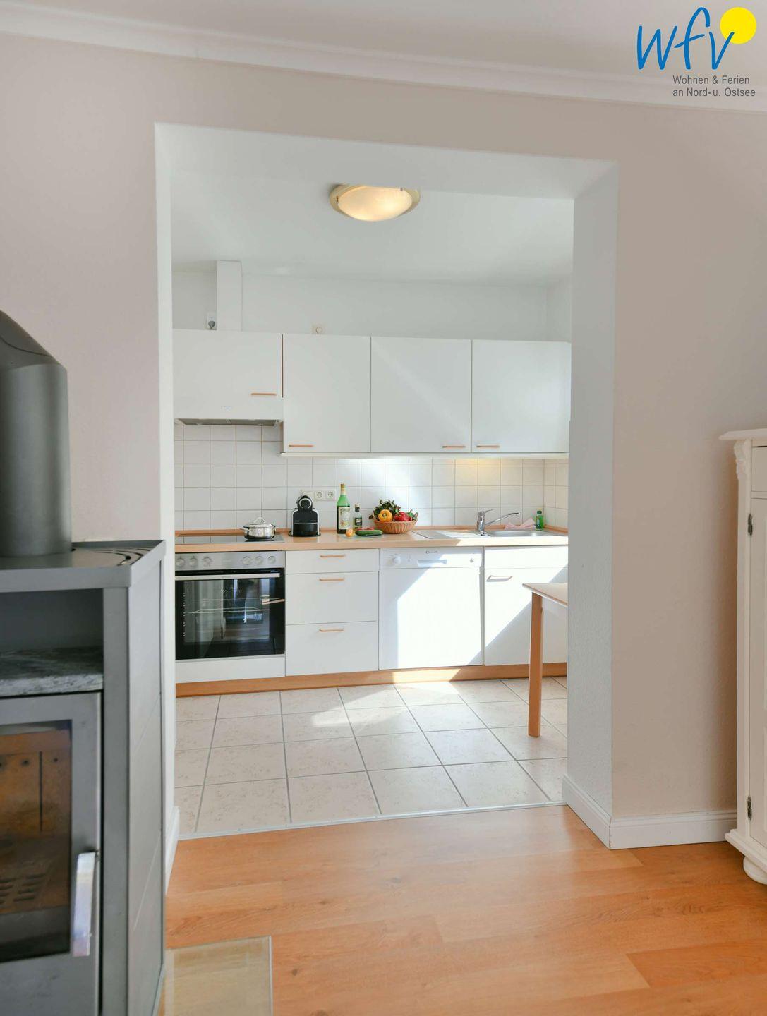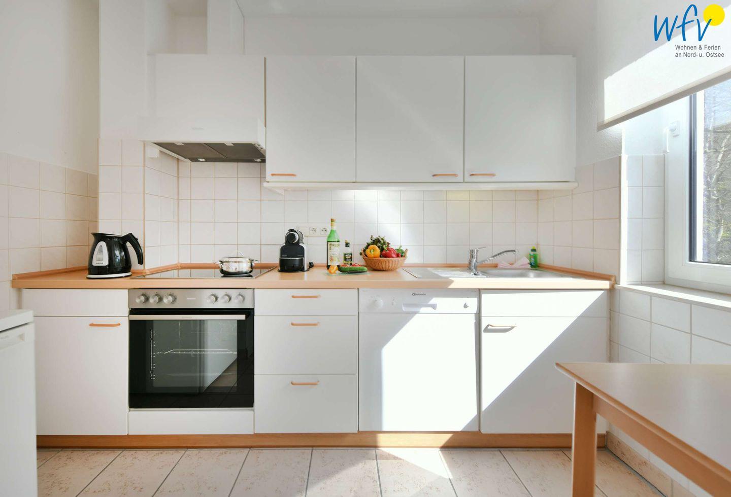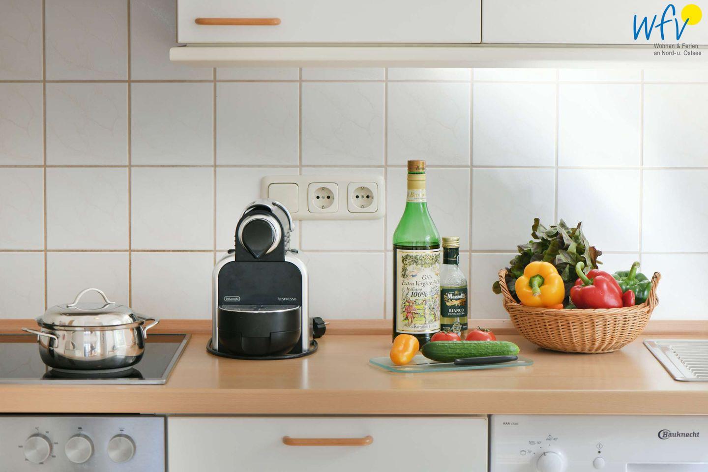 Für eine bequeme Selbstverpflegung ist die Küchenzeile der Ferienwohnung u.a. mit einem 4-Plattenherd, Backofen und Kühlschrank mit Gefrierfach, Mikrowelle und Geschirrspüler sowie Kaffeemaschine, Kaffee-Vollautomat (mit Kapseln), Wasserkocher und Toaster ausgestattet.