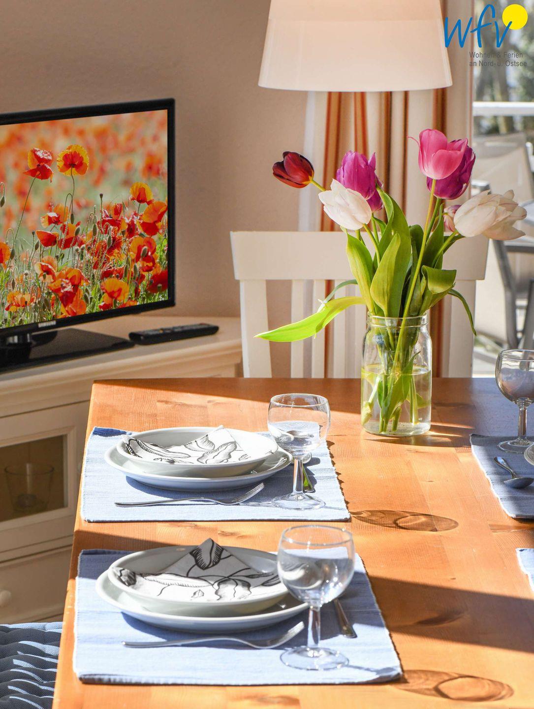 Zu der Ausstattung der Ferienwohnung gehören ein modernes TV und eine HiFi-Anlage, außerdem empfangen Sie freies WLAN - selbstverständlich kostenlos.
