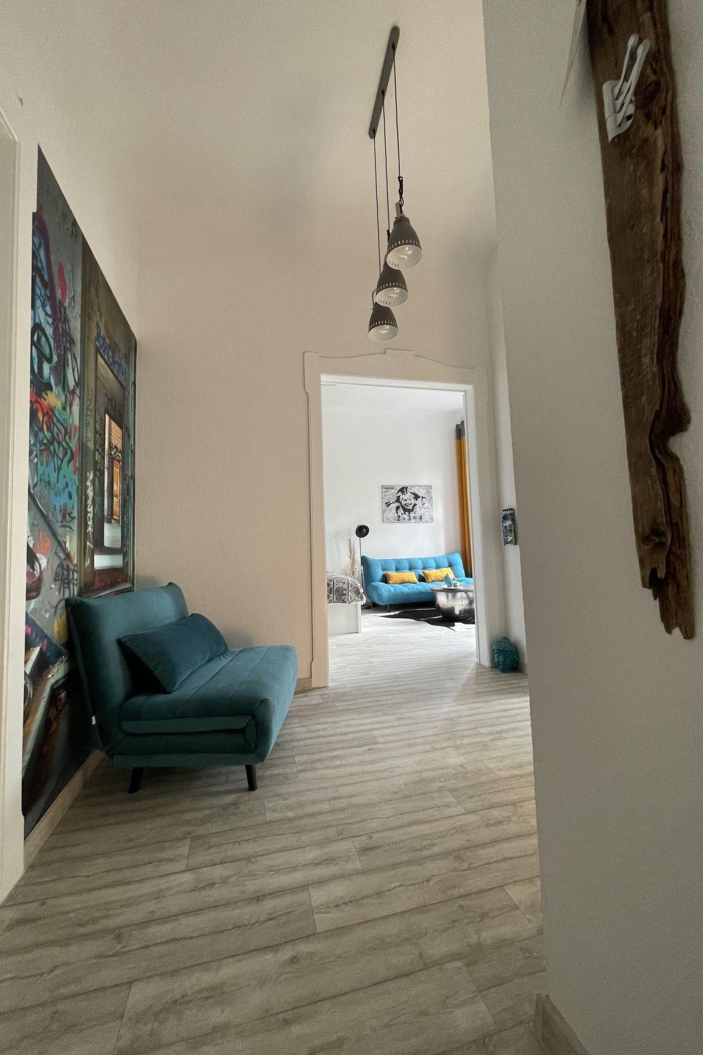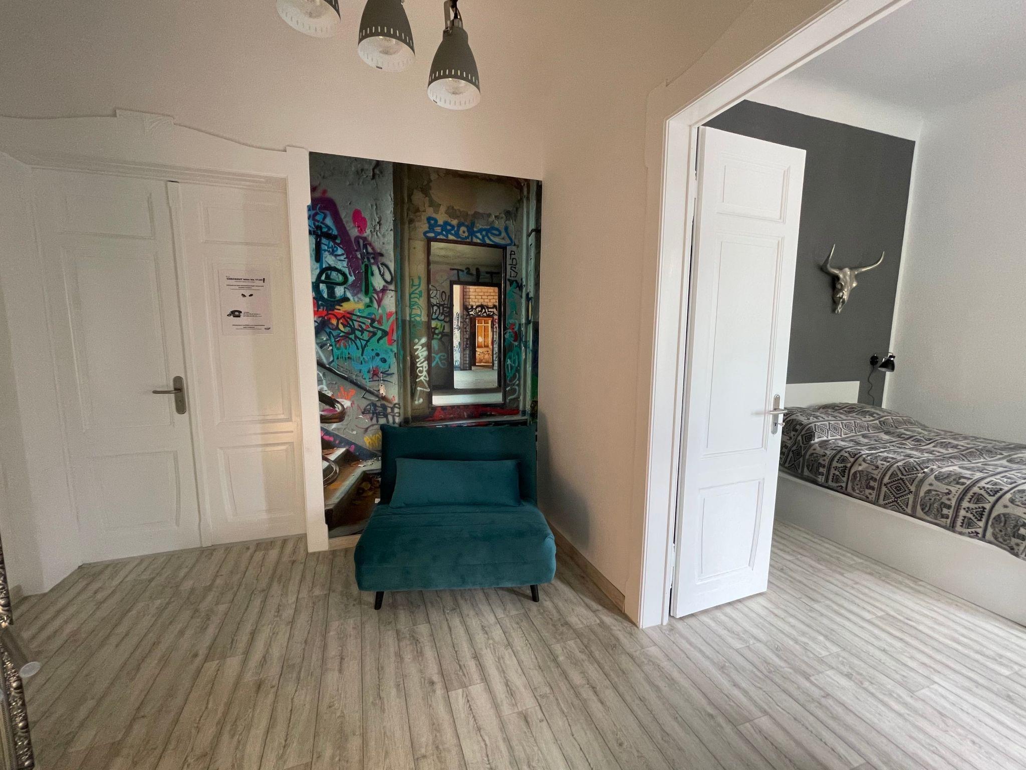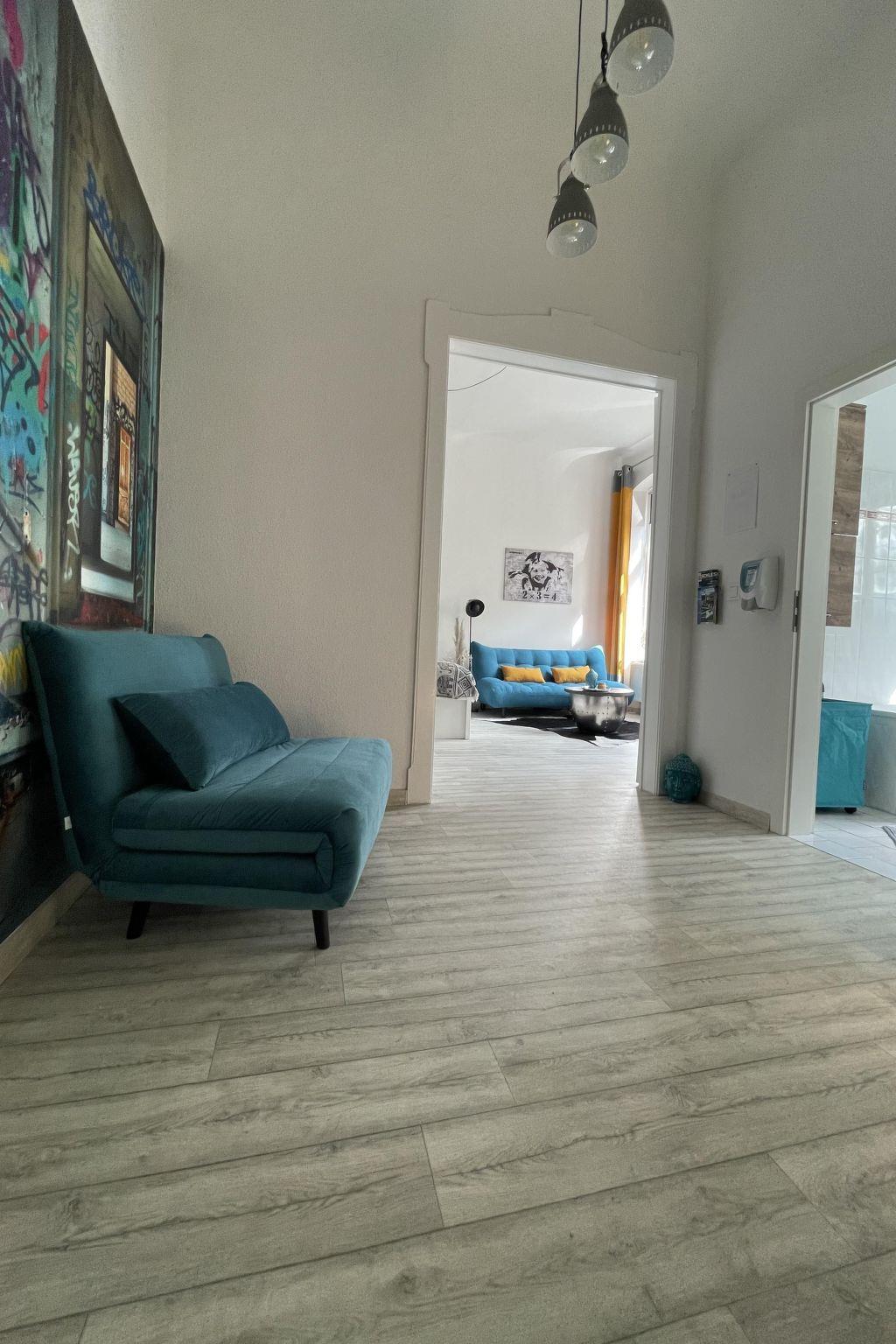 Es gibt 5 Schlafplatze für Erwachsene (Kingsize Bett für 2 Personen, ausziehbare Schlafcoach im selben Raum für 2 Personen und im Flur eine Schlafcoach ausklappbar für 1 Person und 1 Kinderbett. Ideal ist das Apartment für eine kleine Familie mit bis zu 2 Kindern. Und ja, es ist Altbau mit 3,50m Deckenhöhe. Da kommt Feeling auf. Einfach relaxen, bequem Fernsehen oder mit 100 MBIT Internetzugang Filme ONLINE streamen. Für Dauermieter ist zudem der große Kleiderschrank perfekt geeignet. Wenn du Lust hast kurz über die Grenze laufen (50m) und günstig einzukaufen oder im Afirmacije in Polen (200m) einen Cocktail schlürfen – kein Problem. Du wirst bestimmt auch den Spaziergang an der Neisse (100m), im Stadtpark in Görlitz (100m) oder Polen (200m) schätzen. Die Innenstadt mit Fußgängerzone ist übrigens in 5 Minuten zu erreichen, ebenso wie die historische Altstadt. Weclome in Görliwood!