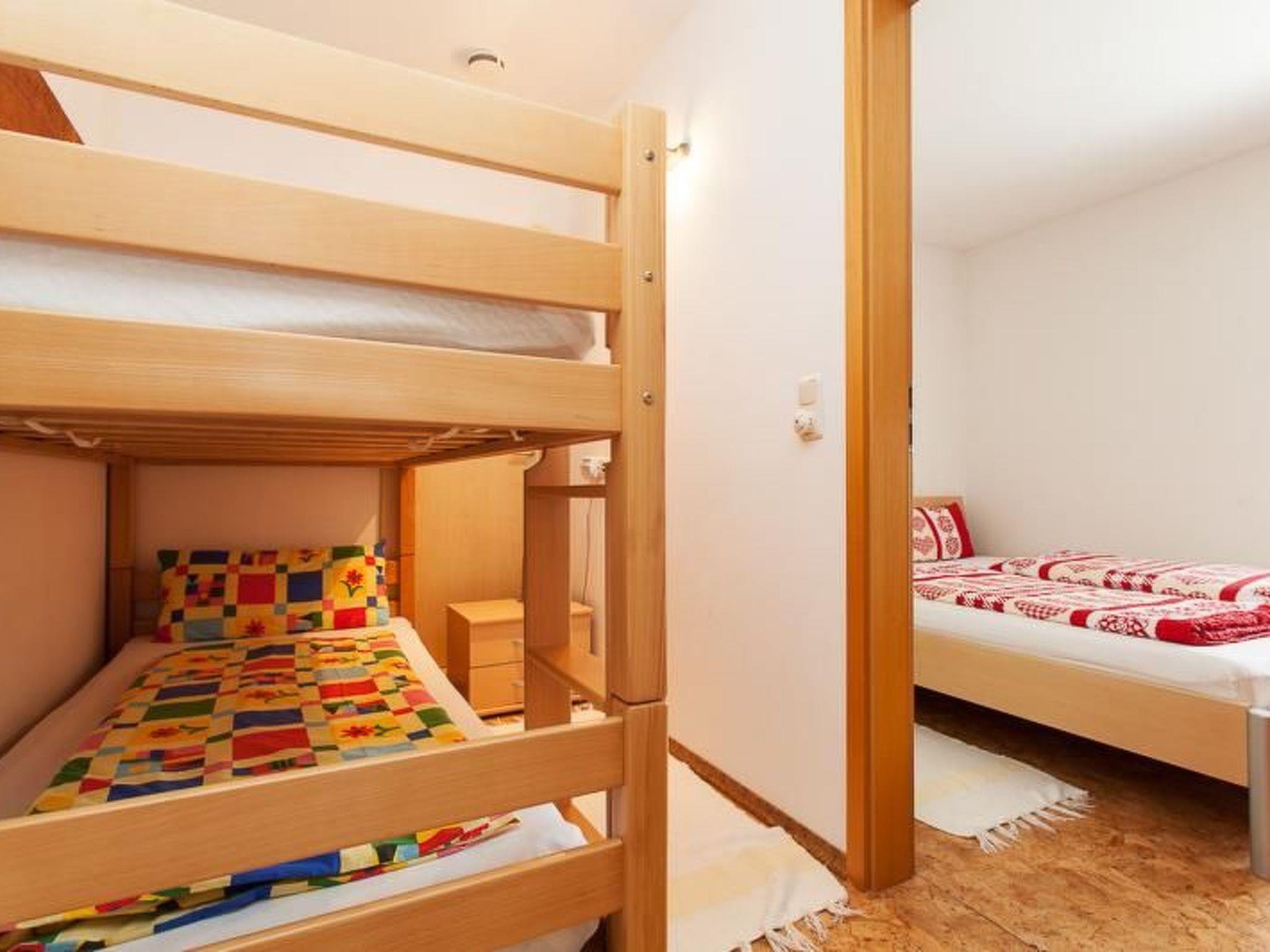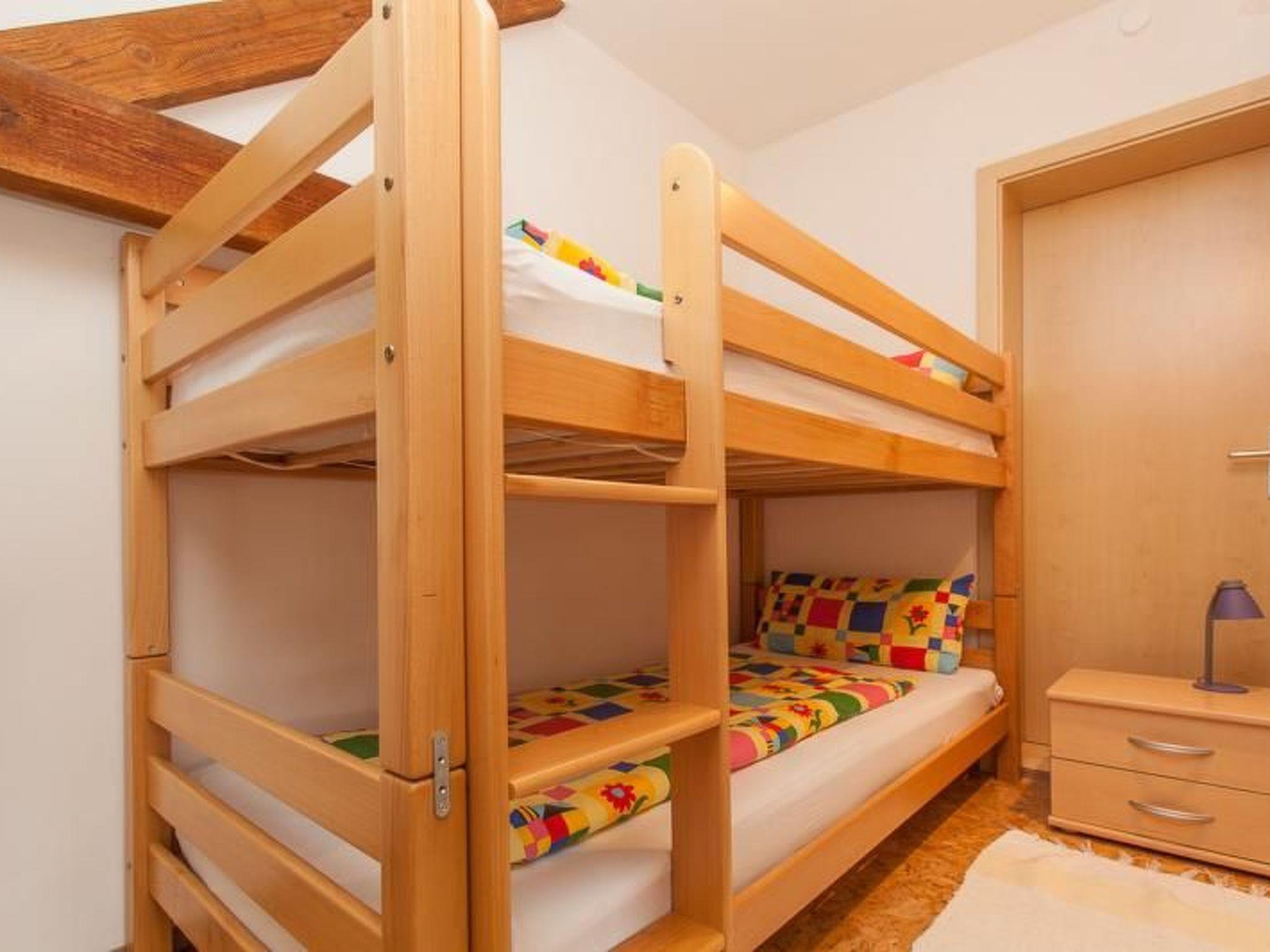 Inside, the flat has a fully equipped kitchen that leaves nothing to be desired: From an oven with 4 hobs to a coffee machine, dishwasher, kettle and toaster, everything is provided. The living room also has a spacious sofa and a colour TV with satellite connection for entertaining evenings. The bedroom with a cosy double bed and the children's room with a bunk bed round off the comfortable interior. The bathroom/WC is equipped with a shower.