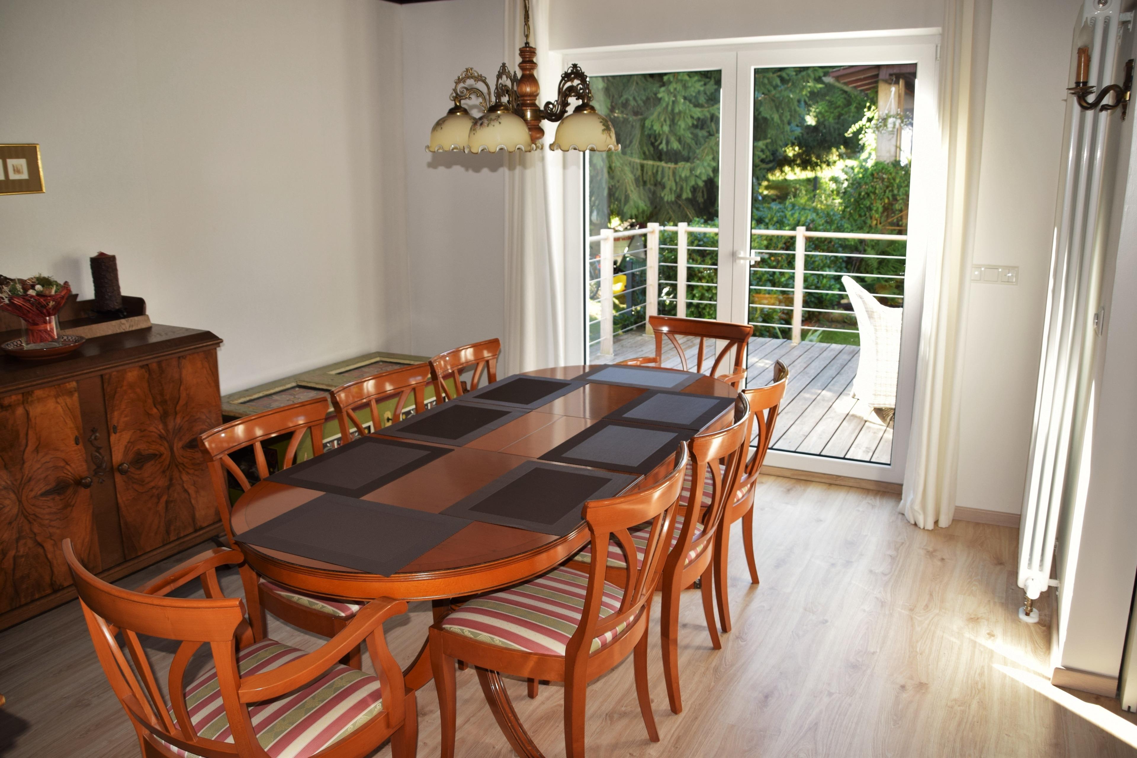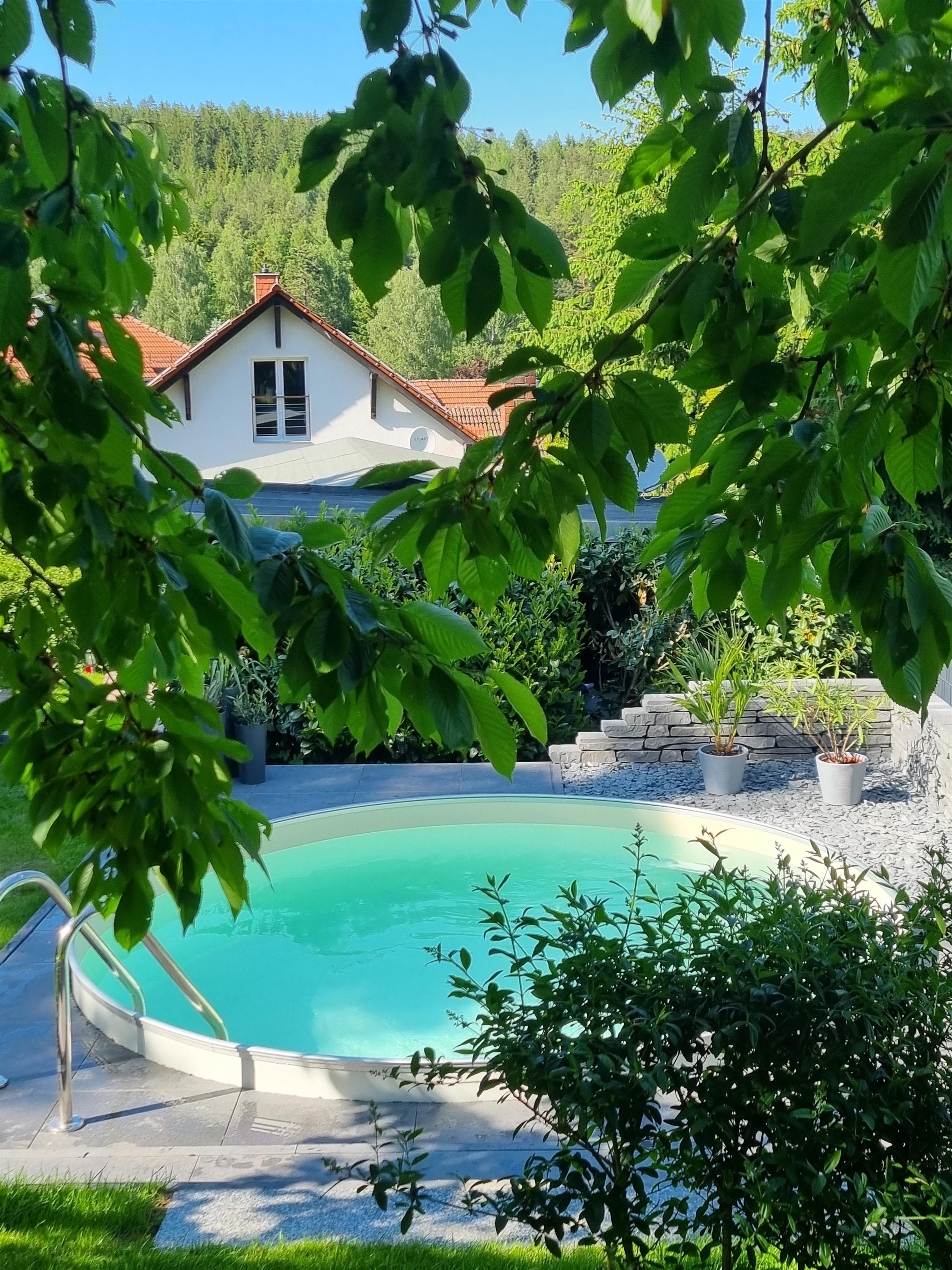 Unser Ferienhaus (Einfamilienhaus excl. Kellerräumlichkeiten) steht Ihnen zur Alleinnutzung zur Verfügung. Über eine Treppe erreichen Sie die Wohnebene im 1. OG mit einer großen Küche, einem Bad/WC/Bidet sowie mit Badewanne bzw. Wannendusche, einem dritten Gäste-Schlafzimmer und den Wohn- und Esszimmerbereich mit außenseitig davor befindlicher Terrasse, über die Sie in den angrenzenden Garten mit Pool, Liegewiese, Sonnen-Séparée und Grillplatz gelangen.