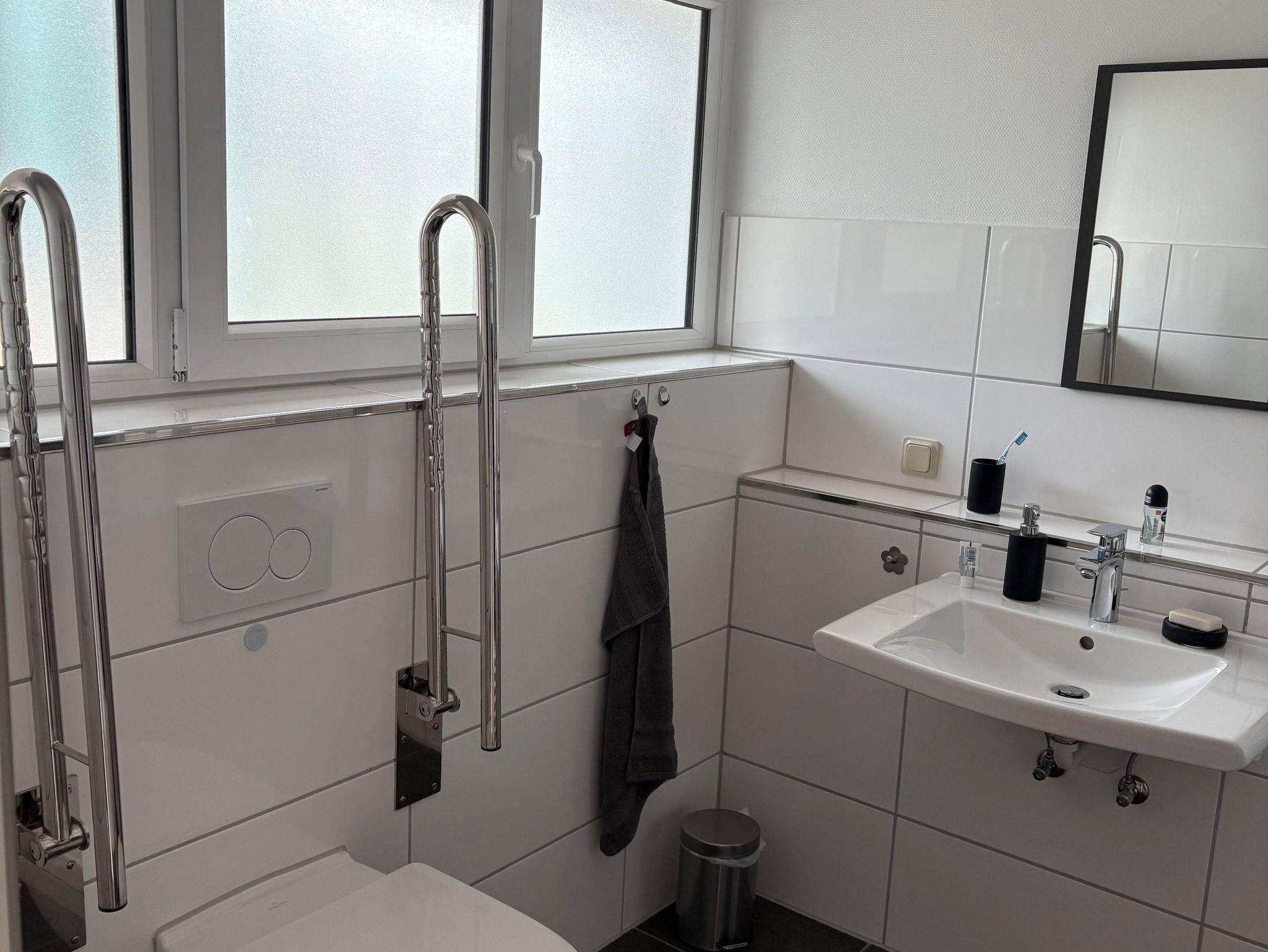Dieses großzügige Apartment empfängt Sie mit einem separaten Eingang und einem einladenden Vorraum. Es verfügt über ein gemütliches Schlafzimmer mit Doppelbett sowie über ein weiteres, separat gelegenes Doppelzimmer mit Kleiderschrank, Nachttischlampen und viel Tageslicht. Das Herzstück der Unterkunft ist die helle, voll ausgestattete Wohnküche mit großzügigem Esstisch für bis zu sechs Personen – ideal für gemeinsame Mahlzeiten. Zur Ausstattung gehören Kaffeemaschine, Wasserkocher, Mikrowelle, Geschirrspüler und alle notwendigen Küchenutensilien für einen angenehmen Aufenthalt. Das Wohnzimmer ist großzügig gestaltet, mit einem großen Sofa, Flachbild-TV und breiten Fenstern für viel Licht – der Boden ist bewusst ohne Teppich gestaltet. Zwei moderne Badezimmer bieten maximalen Komfort: Eines ist mit einer großen begehbaren Dusche mit Haltegriffen, Waschbecken und WC ausgestattet – ideal für Gäste mit eingeschränkter Mobilität. Das zweite Badezimmer verfügt über eine Badewanne, zwei Waschbecken, ein WC, ein Bidet, einen großen Spiegel, Kosmetikspiegel sowie einen Handtuchtrockner. Die gesamte Unterkunft ist mit Heizkörpern ausgestattet und bietet viel Platz zum Wohlfühlen – perfekt für Familien, Paare oder Gäste, die Wert auf Komfort legen.