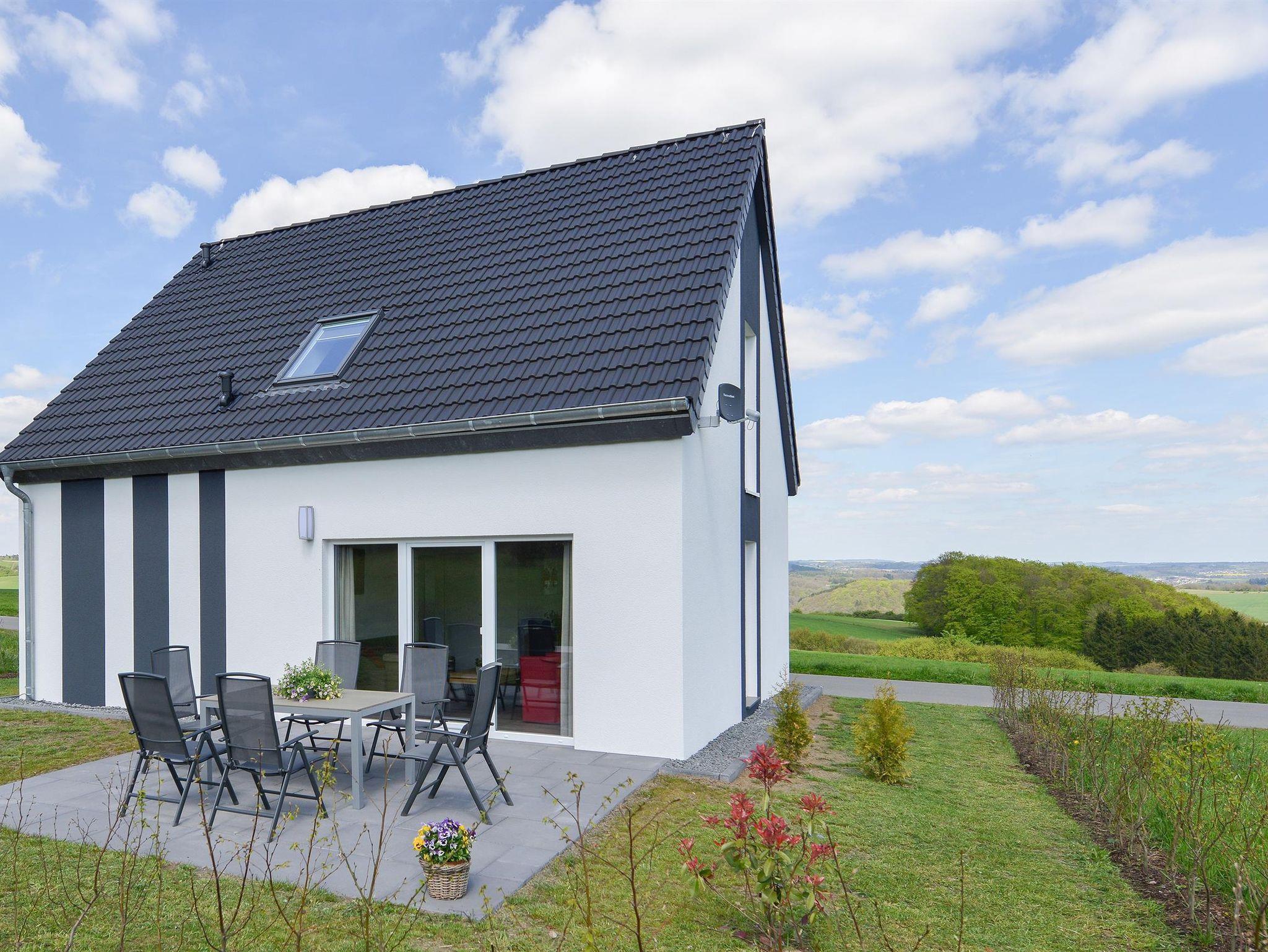 Ein geräumiges, luxuriöses 6-Personen-Haus mit eigenem Garten im Ferienpark Pulvermaar. Im extra großen Wohnzimmer finden zwei mal 6 Personen in verschiedenen Sitzecken Platz. Der große Esstisch mit Sitzecke bietet Platz für die ganze Familie.