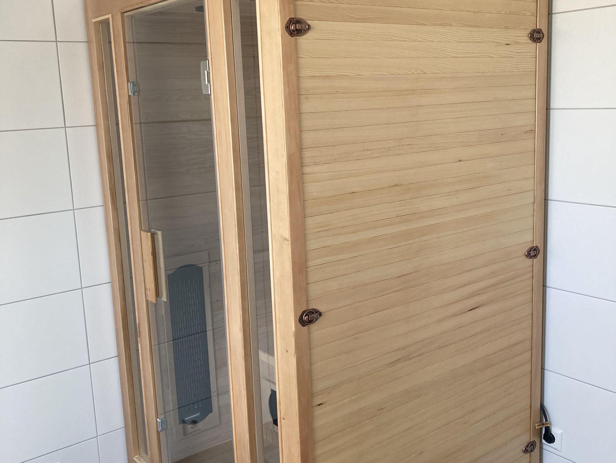 Das Badezimmer im Erdgeschoss verfügt über eine Toilette, ein Doppelwaschbecken und eine geräumige DuschKabine. Das Schlafzimmer im Erdgeschoss verfügt über ein geräumiges Doppelbett und einen großen Kleiderschrank mit Spiegel. Im ersten Stock befinden sich zwei Schlafzimmer, eines mit Doppelbett, Kleiderschrank und Sitzecke mit einem Sesseln. Das dritte Schlafzimmer hat zwei Einzelbetten, einen Kleiderschrank und eine Sitzgelegenheit mit einem Sessel. Das Badezimmer im ersten Stock befindet sich zwischen den beiden Schlafzimmern und ist sehr geräumig. Im Badezimmer ist eine Toilette vorhanden, sowie ein Doppelwaschbecken und eine Duschkabine. Es gibt auch eine schöne Infrarotsauna in diesem Badezimmer.