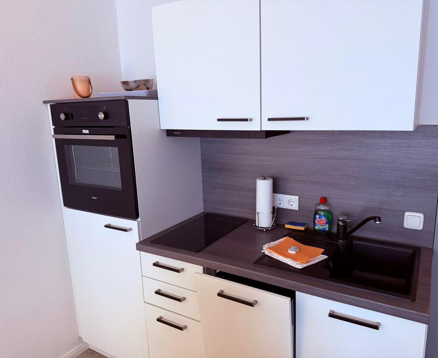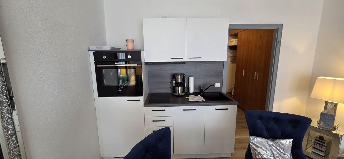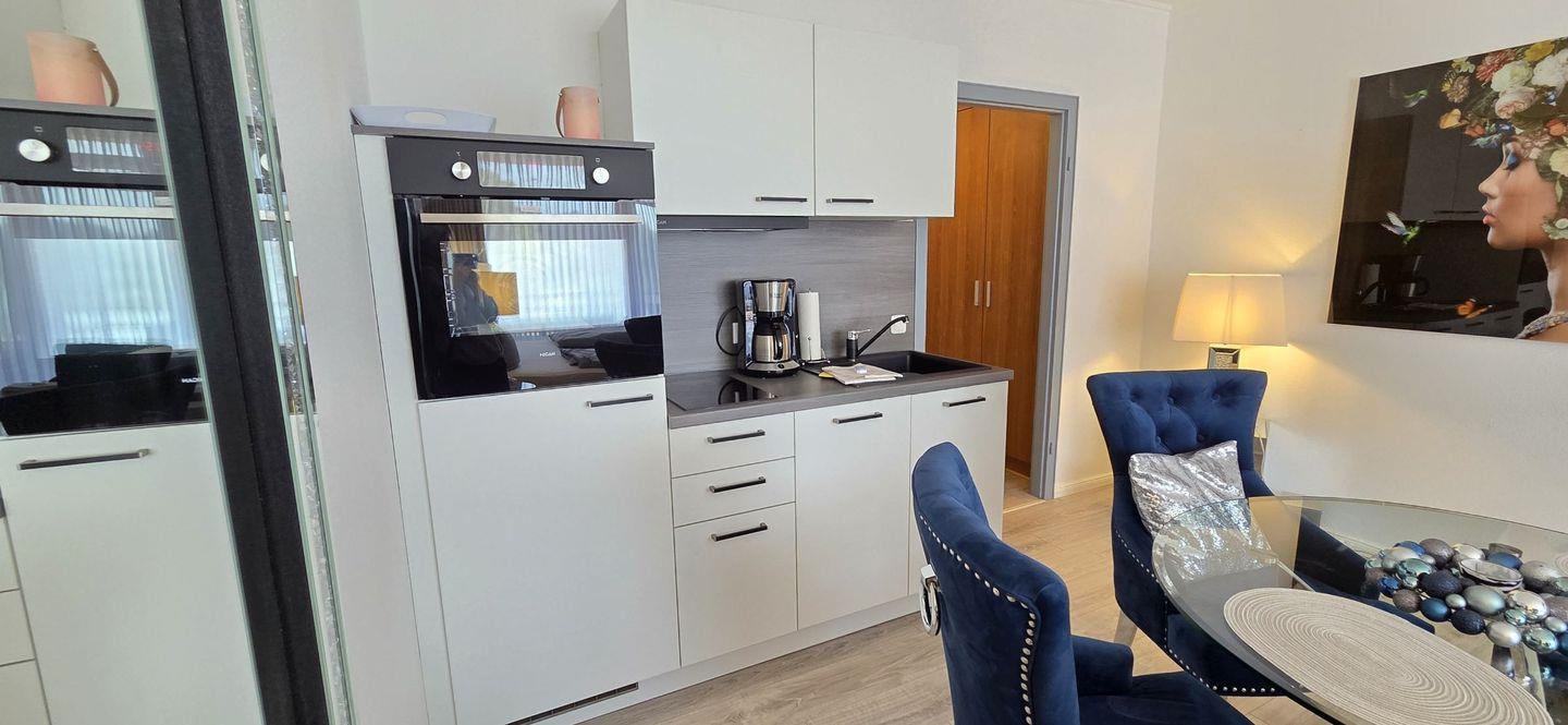 Die offene Küchenzeile ist mit Mikrowelle, 2-Platten-Ceran-Herd, Spülmaschine, Kühlschrank mit Gefrierfach, Kaffeemaschine, Wasserkocher und vielem mehr voll ausgestattet.
