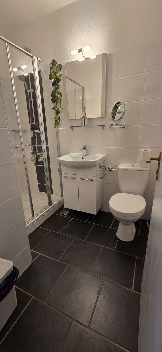 - Bad mit DU/WC, Fön, Kosmetikspiegel und Hygieneartikel
