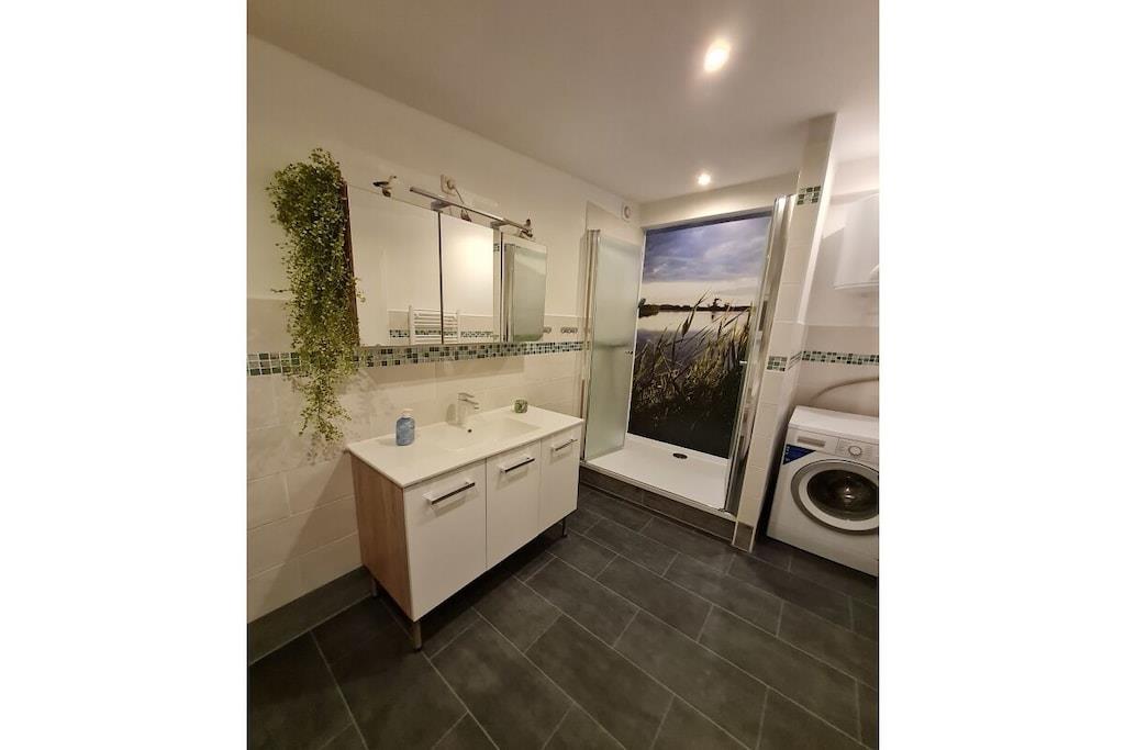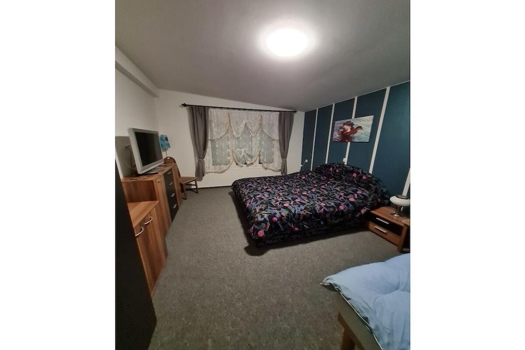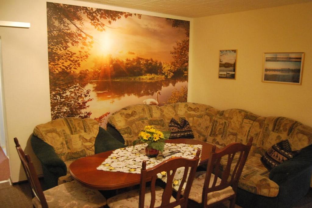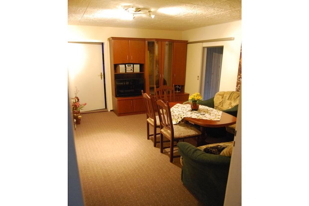 Bottenvåningen: (Hall, Vardagsrum(Bäddsoffa 1 pers., TV), Kök(matbord, Braskamin, Kokplattor, vattenkokare, brödrost, kaffebryggare, ugn, mikrovågsugn, diskmaskin, kylskåp, frys), sovrum(dubbelsäng, TV, radio), sovrum(enkelsäng, enkelsäng), sovrum(enkelsäng, dubbelsäng, TV), badrum(dusch, handfat, toalett , tvättmaskin, hårfön, Inkl. handdukar), badrum(dusch, handfat, toalett , hårfön, Inkl. handdukar)) tvättmaskin, terrass, trädgård, trädgårdsmöbler, parkering, Parasoll, cyklar tillgängliga, strykbräda, strykjärn