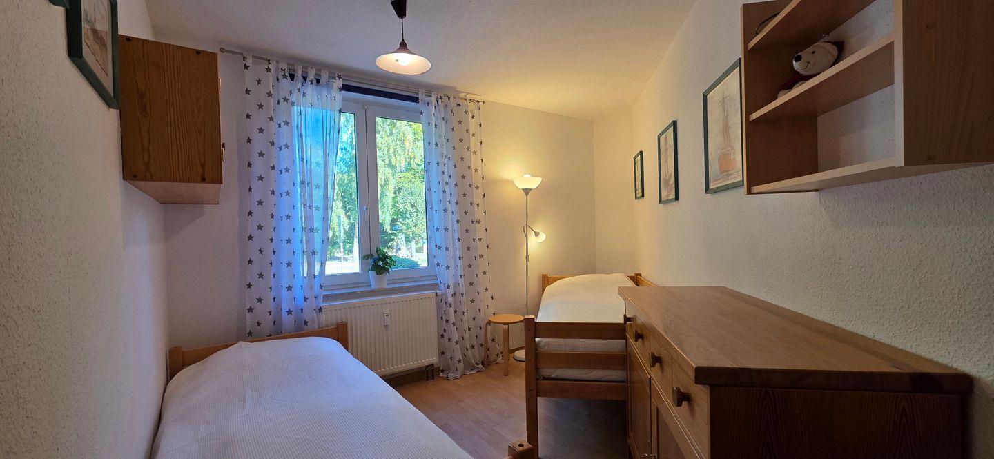 1 Schlafzimmer mit zwei Einzelbetten, direkt gegenüber der Wohnung über den Hausflur erreichbar