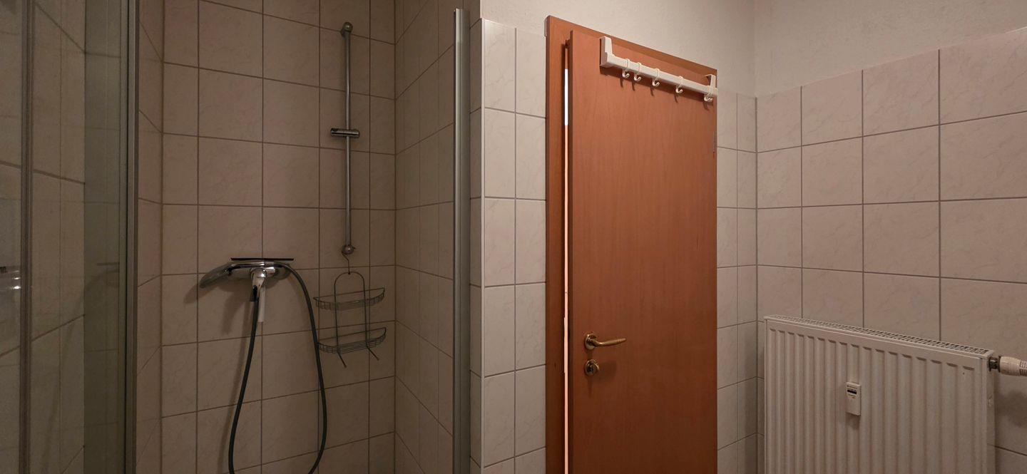 • Badezimmer mit Dusche, WC, Waschbecken und Haartrockner