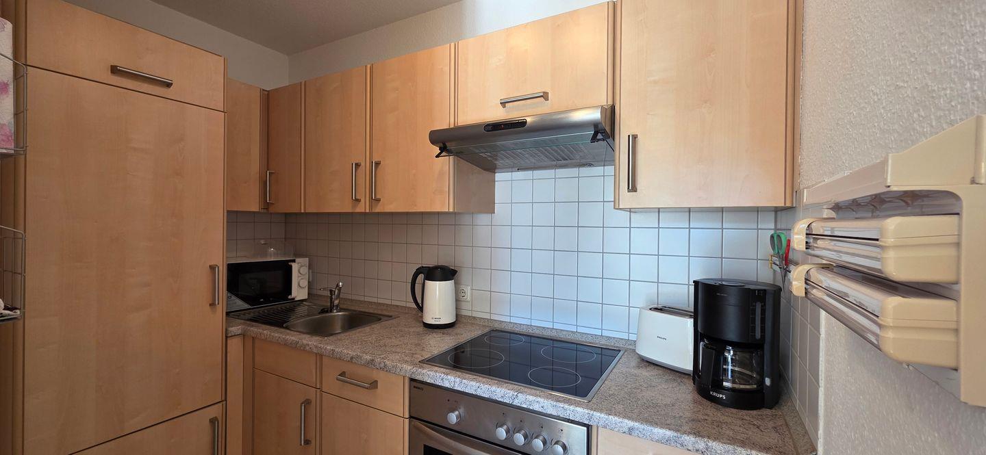• Küche mit Herd & Backofen, Kühlschrank mit Gefrierfach, Mikrowelle, Geschirrspüler, Kaffeemaschine, Wasserkocher und Toaster