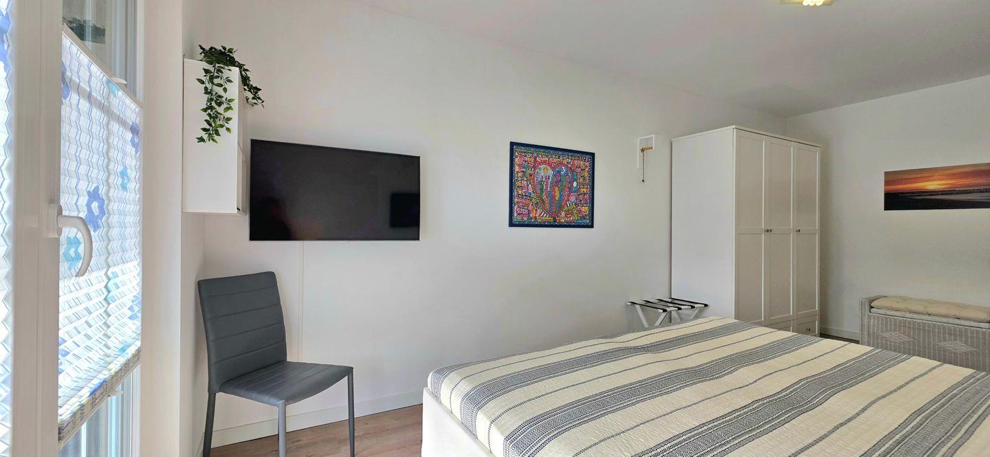 • Schlafzimmer mit Doppelbett (200 cm x 200 cm, geteilte Matratze), Schreibtisch und zweiter TV