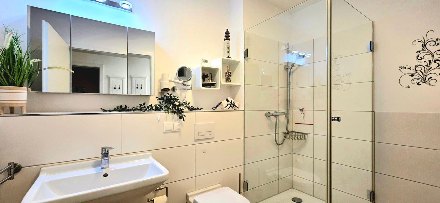 • Badezimmer mit ebenerdiger Dusche, Fön und Ablagefläche
