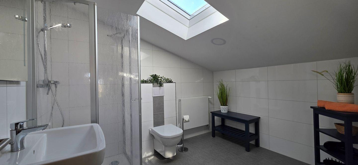 • Tageslichtbadezimmer mit Dusche, Waschbecken, WC und Fön